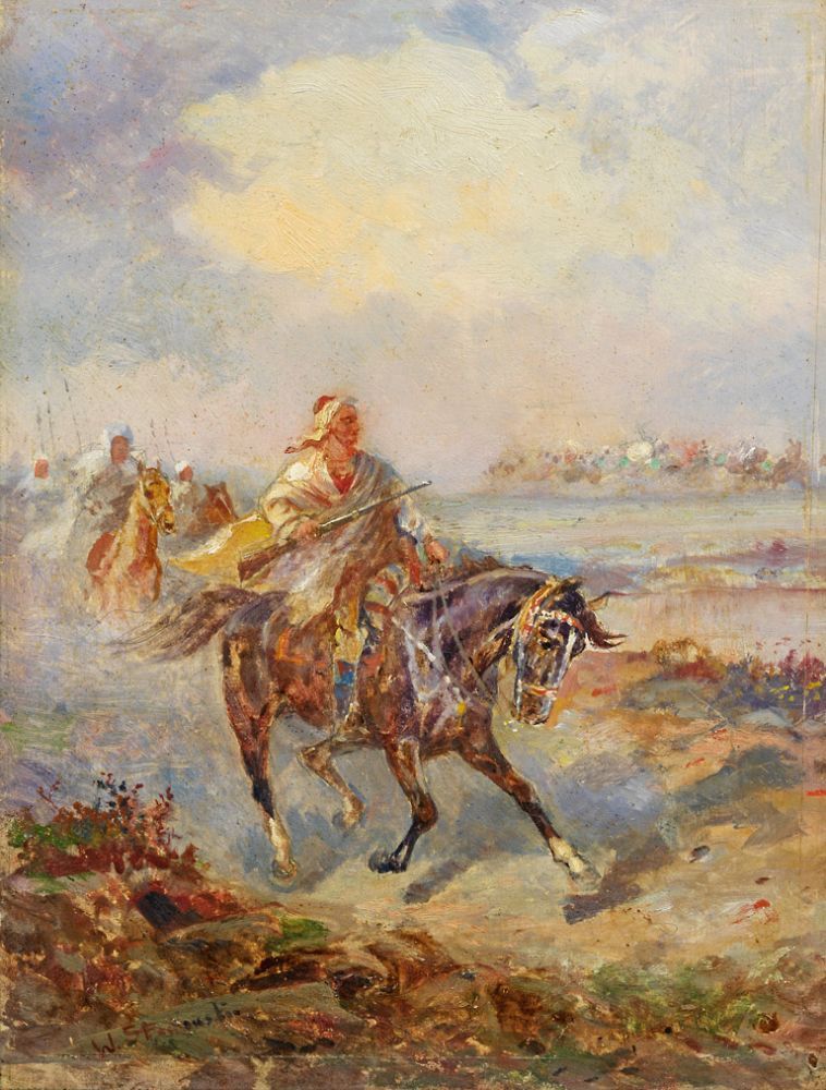 lot 1313. Wladyslaw Stachowski (1852 Kuba/Aserbaidschan – 1932 Warschau. Arabische Reiter zu Pferde. Motivtypisches Werk des polnischen Künstlers, der 1879-1888 an der Akademie im russischen St. Petersburg studierte und im Kaukasus, in München sowie ab 1919 in Polen ansässig war. Öl/Sperrholztafel. L. u. sign.; 31,3 cm x 23,8 cm. (160044) Arabs on horseback. Oil on plywood panel. Signed. Reserve 900 €.