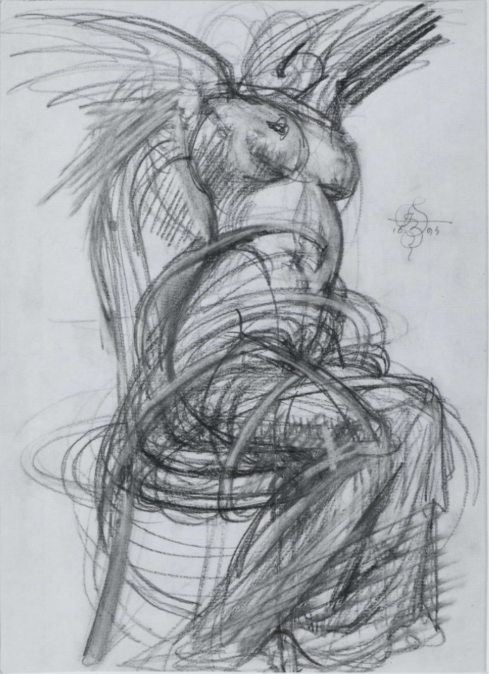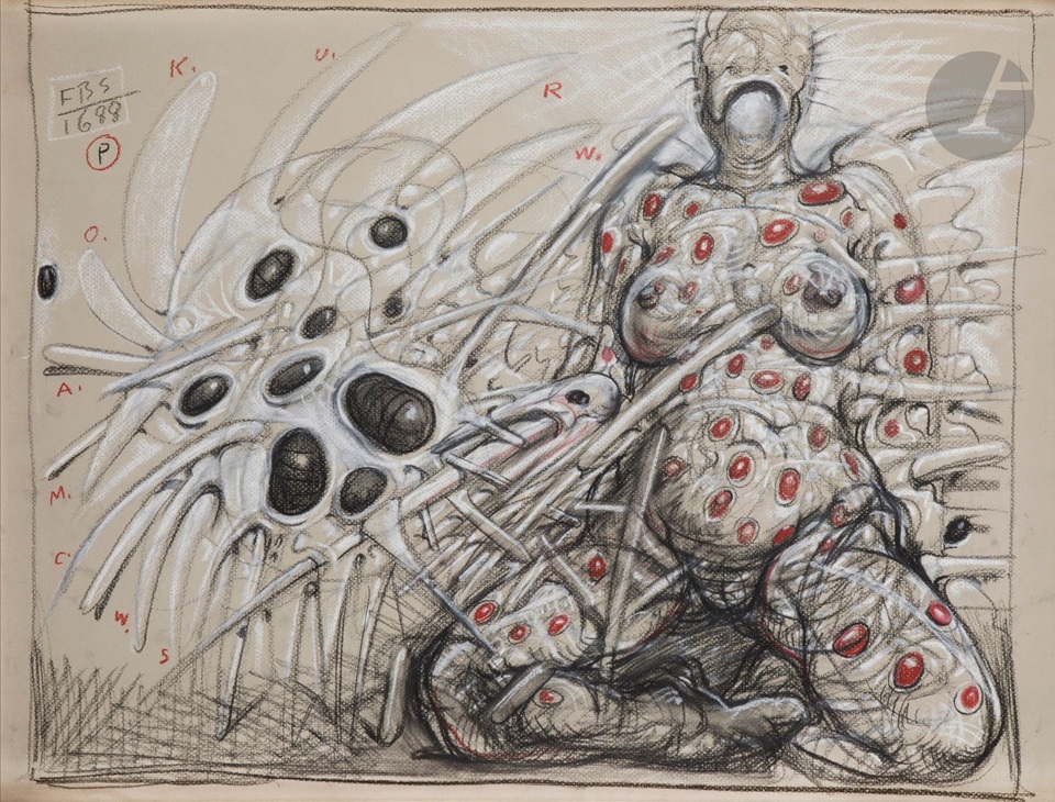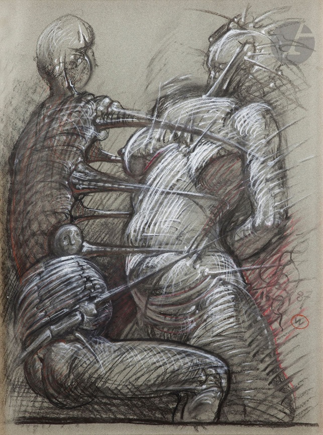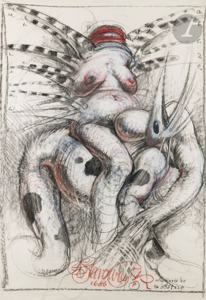 Lot 172. Franciszek STAROWIEYSKI (1930-2009). Allegory of stupidity, 1986. Charcoal and pastel. Signed, titled and backdated below. 99 x 69 cm (on view). Estimate 3,000 – 4,000 euro. Ader. 03/20/25. Sold 5,200 euro