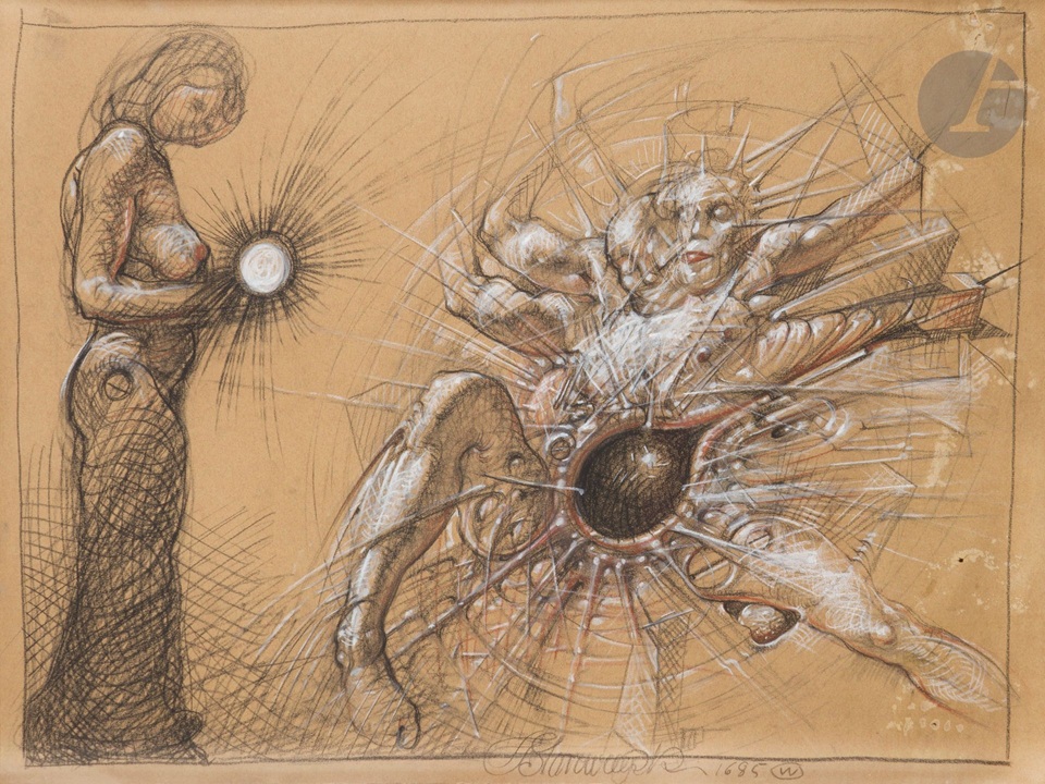 Lot 6. Franciszek STAROWIEYSKI (1930-2009). Untitled, 1988. Charcoal, red chalk and chalk. Monogrammed, dated 1688 and located P(aris) top left. 49 x 63.5 cm. Framed. Bibliography : Franciszek Starowieyski (1930-2009) exhibition catalog. Przyjaźnie paryskie 1683-1693. Kolekcja A. i N. Avila, Sopot 2014, p. 152. Provenance: Alin Avila Collection. Estimate €1,500 – 1,800. Ader. 09/30/25. Sold €4,500
