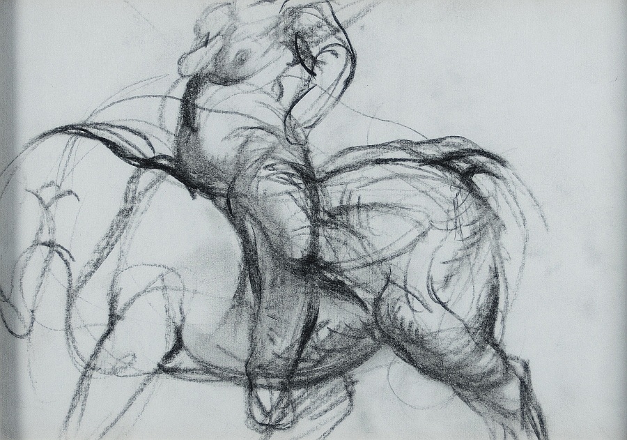 Lot 183. Franciszek Starowieyski 1930 Bratkowka/Kosno – 2009 Warschau. Riding Nude. Charcoal on paper; H 210 mm, W 290 mm; verso copy of the label of the Galeria Sztuki Katarzyny Napiorkowskiej, Brussels/Warsaw with description. Estimate €900 – 1,100. Peter Karbstein Kunst- und Auktionshaus. 11/08/25. Passed