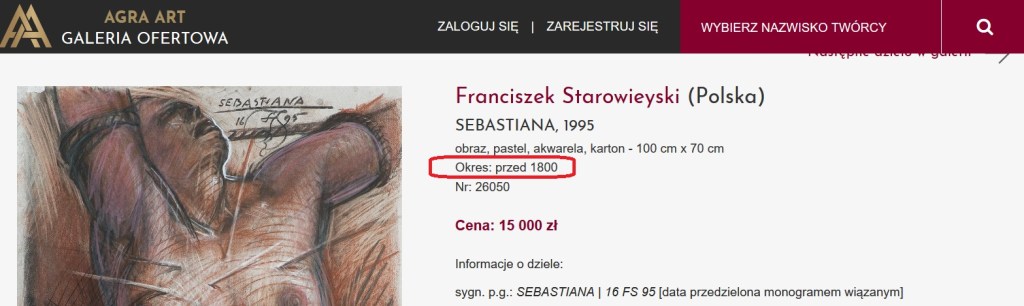 Prace szkicowe Franciszka Starowieyskiego słabo się sprzedają, zarówno w Polsce i na pozostałych rynkach. Na czerwcowej aukcji we Francji sprzedano tylko jeden z trzech jego szkiców. W Polsce panuje ciekawa ostrożność na tle prac Starowiejskiego być może na tle wygenerowanej w 2005 roku afery związanej z falsyfikatem j pracy Zjawa, sprzedanej w Polswissart z certyfikatem autentycznosci podpisanej przez ‘eksperta’ https://www.tvn24.pl/wiadomosci-z-kraju,3/falszywa-zjawa-starowieyskiego-pogrzebala-eksperta,263167.html, ze__Zjawa___Final_bezprecedensowej_prowokacji.html. Nawet bardzo dobry pastel Starowieyskiego Sebastiana spadł w Agrze Art na aukcji kilka dni temu i jest do nabycia w galerii z zabawnie zakwalifikowanym, przez jakiegoś sezonowego pracownika, okresem powstania ‘Okres: przed 1800’ (czyżby na podstawie datowania pracy ‘1695′ przez artystę?).