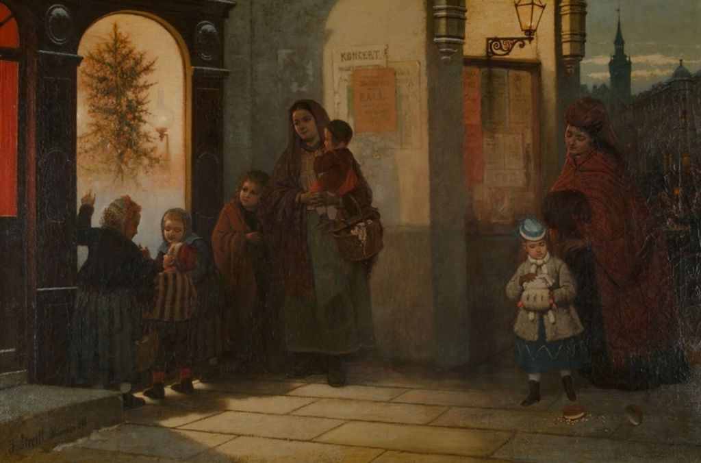 Obraz Franciszka Streitta, znany z opisu biograficznego, wypłynął chyba po raz pierwszy na rynek po ponad 60 latach. Nie spotkałem się z replikami tej pracy. Artysta podjął się przedstawić poważny temat nierówności społecznej w postaci sceny rodzajowej związanej z Bożym Narodzeniem, gdzie dostatek sąsiaduje z biedą. Tego typu sceny kontastu były dość powszechne w malarstwie europejskim XIX w i praca Streitta wpisuje się w ten wątek świadcząc o jego wrażliwości.