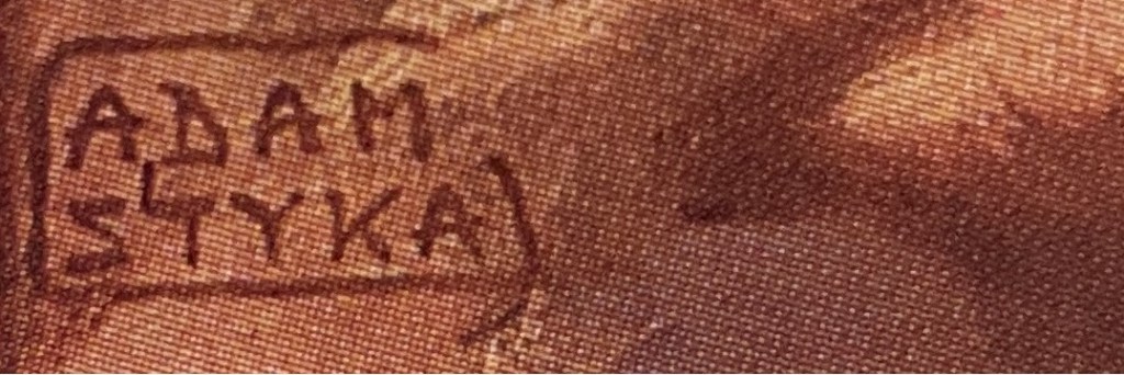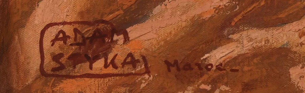 #3. Adam Styka. Sous les remparts de Marrakech, 1920. Oil on canvas, 98 x 120.9 cm. Christie’s. Estimate GBP 15,000 – 20,000. 07/13/23. SOLD 28,000 GBP. Exposition de Tadé et Adam Styka – Galeries Georges Petit – Paris 1920 (original labels verso)Sygnatura na obrazie z Christies#4. Adam Styka. Ruelle baignée de soleil. Huile sur toile, 54 x 65cm. Gros & Delettres. Estimate 4,000 – 6,000 euro. 06/25/18. SOLD 3,600 euroSygnatura na obrazie z Gros & Delettres#5. Adam Styka. In the souk. Oil on canvas, 56.7 x 45.8 cm. Christie’s. Estimate GBP 5,000 – GBP 7,000. 11/30/2006. Sold GBP 15,600Sygnatura na obrazie z Christies#6.Adam Styka. Arabes cheminant dans une rue de Fès. Huile sur toile, 63 x 84 cm. Rouillac. 06/09/2013. SOLD 18,500 €Sygnatura na obrazie z Roulliac#7. Adam Styka. Pochodzenie obrazu jest mi nieznaneSygnatura z powyższego obrazu Adama Styki#8. Adam Styka. Rue animée dans la médina de Fès. Oil on canvas; h: 127 w: 87 cm. Artcurial. Estimate €18,000 EUR – €25,000 EUR. 12/18/2011. SOLD €30,450. Sygnatura na obrazie z Artcurial#9. Adam Styka. A little street in Morocco. From the book “The Styka Family Saga” by Czesław Czaplińki, p. 164. No information on medium or size was given. Sygnatura z powyższego obrazu