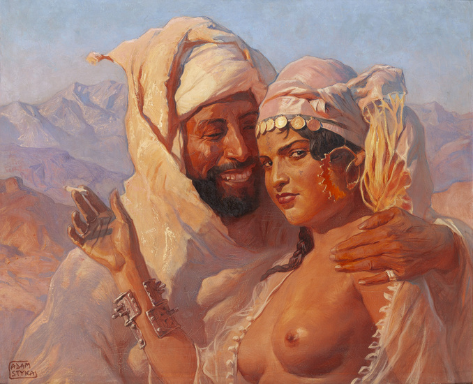 Lot 3. Adam STYKA (1890 Kielce – 1959 Nowy Jork). Amorous (Kochanek) / Marokański romans, przed 1939 r, olej, płótno, 77 x 63,5 cm, sygn. l.d.: ADAM / STYKA / Maroco, opisany i sygn. na odwrocie: “Amorous” / Copyright and reproductions reserved / Adam Styka. Proweniencja: – kolekcja Williama H. Diehla, Nowy Jork, – od 1968 r. kolekcja spadkobierców Williama H. Diehla; (obraz pojawia się w inwentarzu manifestu wysyłkowego z 1968 r. i w wykazie inwentarza ubezpieczeniowego z 1993)