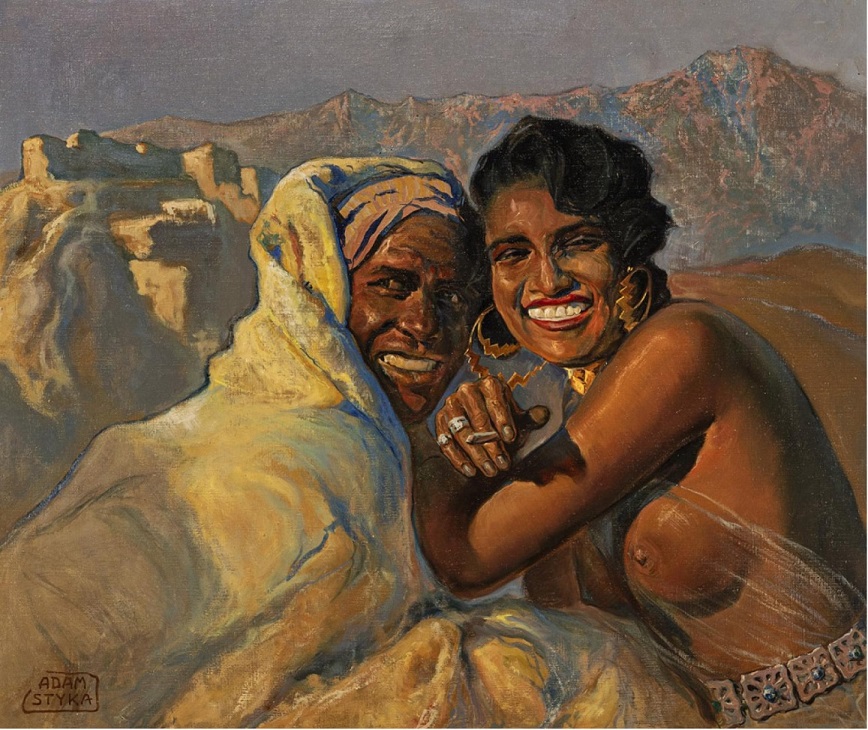 Kolejna podróbka pary arabskiej w wykonaniu rzekomo Adama Styki. Coraz więcej tych podróbek prac tego malarza pojawia się na rynku. Dobrze, że można odszukać oryginalne prace. Olej w Uppsala Auktions, średnio wyceniony jak na prawdziwą pracę Adama Styki, ma swój pierwowzór sprzedany w bostońskim domu Skinner w maju 2012 roku (lot 475), za sumę $22,000 (https://www.skinnerinc.com/auctions/2598B/lots/475). Happy Couple u Skinnera to również olej na płótnie (76.2 x 63.5 cm), płótnie mocno oksydowanym (czyli szlachetnie przez czas) na odwrociu w odróżnienieu od obecnego, dziewiczego, świeżuszeńkiego kanwasu.
