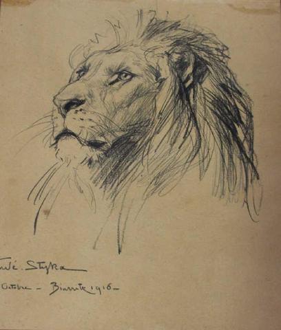 Lot 268. Tadeusz STYKA (1889-1954) Lion Dessin au crayon signé en bas à gauche situé et daté Octobre Biarritz 1916 25×21,5cm Au dos dédicace du Marquis de Montferrier Avec encadrement Expert: Marc Henri Tellier