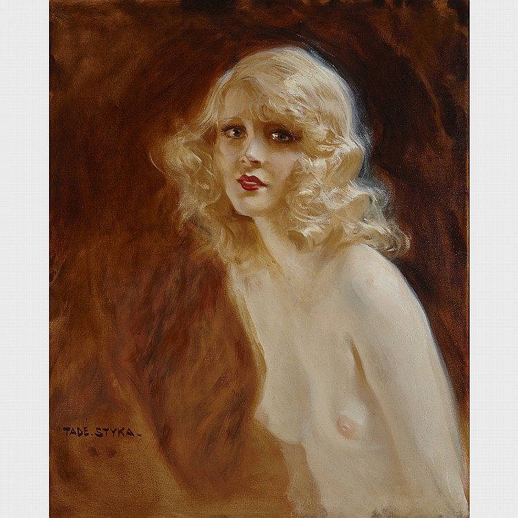 Lot 69. TADEUS STYKA (1889-1954), POLISH/FRENCHNUDE WITH BLONDE HAIROil on canvas; signed lower left. Contained in an antique tortoise-shell frame.31″ x 24.75″ – 78.7 x 62.9 cm.Provenance:Stella Tylkowski, Poland, to Canada with her circa 1940’s; By descent to the present Private Collection, Ontario. Estimated Price: CAD4,000 – CAD6,000