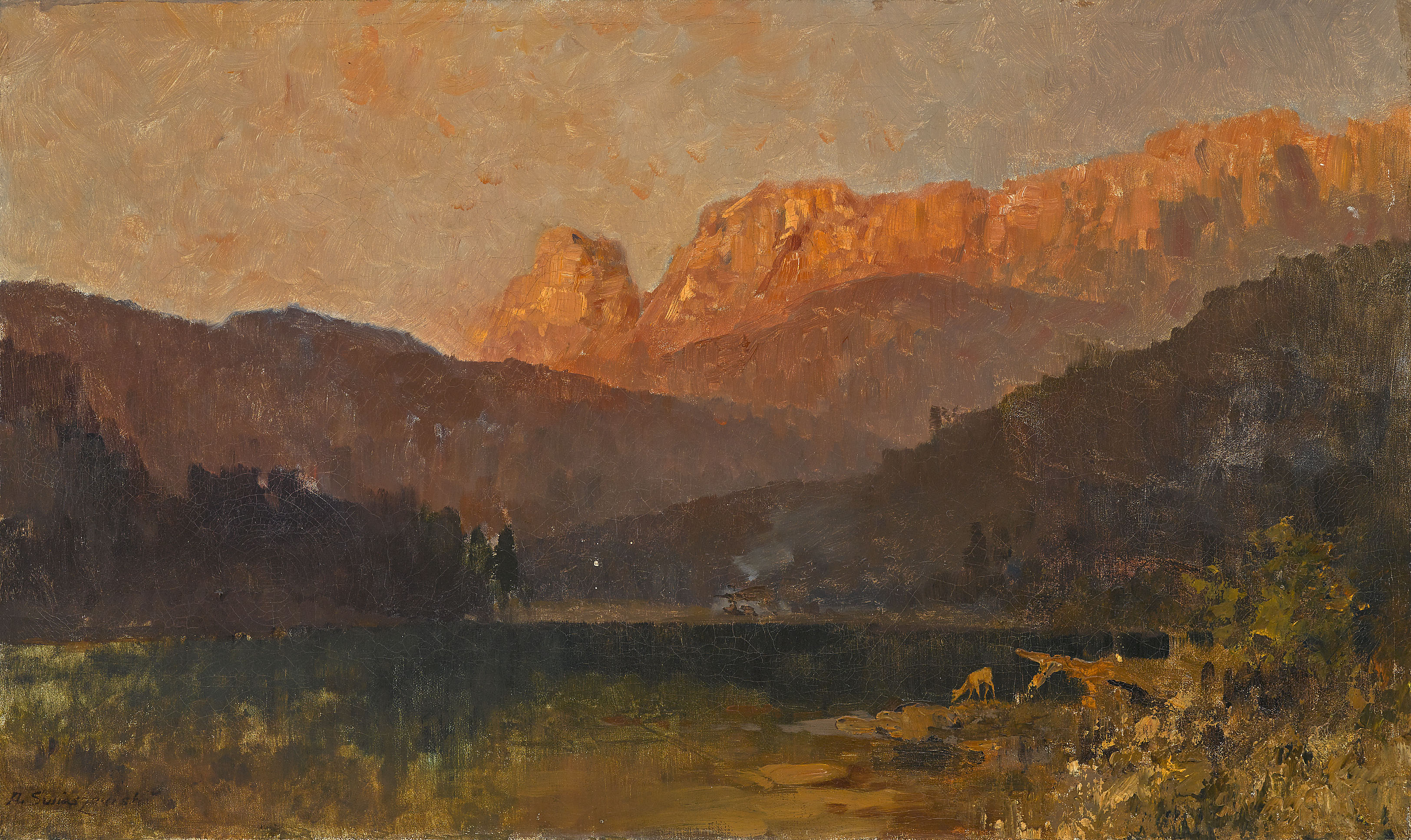 Lot 649. Alexander Swieszewski 1831 Warschau – 1895 München – Sonnenuntergang am Bergsee – Öl/Lwd. 31 x 67 cm. Sign., dat. und ortsbez. l. u.: A. Swieszewski 1873 / München. Etwas angeschmutzt. Vereinzelte Fehlstellen. Lwd. im Bereich der Schmalseite des Keilrahmens angestückt. Estimate €900 – 1,8000. Kastern. 11/15/25. Sold €1,700