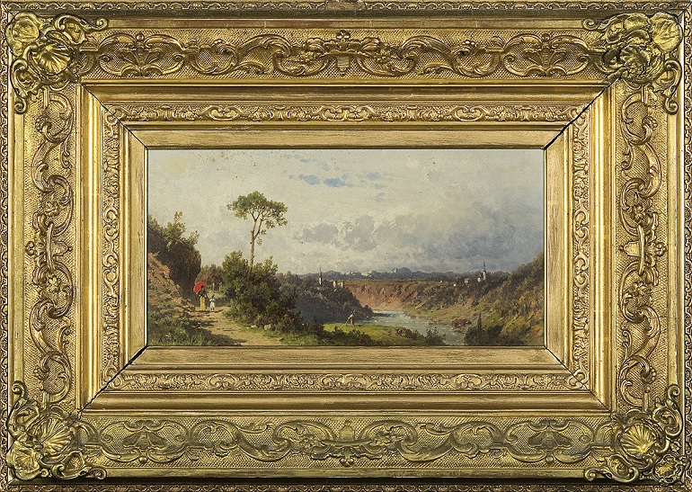 Lot 459. lAeksander Swieszewski (Warschau 1839 – München 1895). Promenade by a River Valley. Oil/wood, 16 x 31,5 cm, lo. le. sign. Swieszewski. – Provenance: Private collection Lower Saxony. – Polish painter. S. studied 1855-69 with interruptions at the academies in Warsaw and Munich. He travelled extensively in Europe and then settled in Munich. Mus.: Warsawa (Nat.-Mus.), Cracow, Prague and others. Lit.: Thieme-Becker. Starting 3,500 euro. Stahl. 09/24/21. Sold 3,500 euro