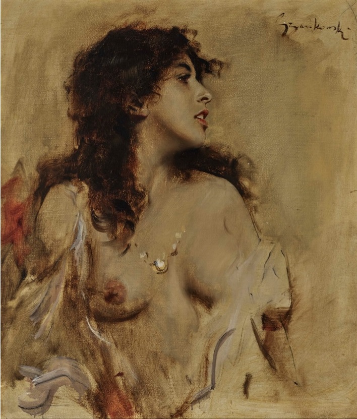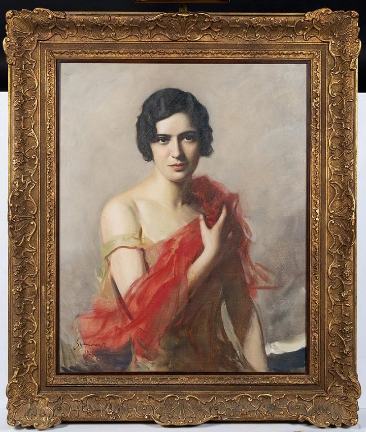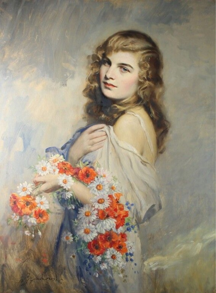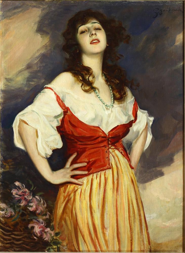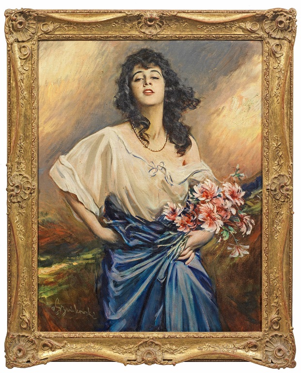 Lot 1776. Boleslaw von Szankowski (1873 Warschau – 1953 Tegernsee). Junge Frau mit Blumenstrauss. Mit schnellem, weich-pastosem Duktus ausgeführtes, repräsentatives Werk Szankowskis, wohl aus den 1930er/40er Jahren. Boleslaw von Szankowski studierte zunächst an der Akademie in Krakau, 1894 an der Münchener Akademie bei Johann C. Herterich (1894) und 1896-1898 in Paris an der Académie Colarossi und Académie Julian. Später ließ er sich in München nieder, wo er von 1906 bis 1925 an den Jahresausstellungen im Glaspalast teilnahm. 1928 und 1939 hatte er große Einzelausstellungen in Warschau. Als Porträtist sehr gefragt, schuf er daneben auch weibliche Akte, idealisierte, raffinierte, teilw. erotische Darstellungen weiblicher Schönheiten und graziöser, eleganter Damen. Öl/Lwd.; L. u. sign.; 93 cm x 75 cm. Rahmen. Oil on canvas. Signed. Opening 4,600 euro. Schloss Ahlden. 09/04-05/21. Not sold