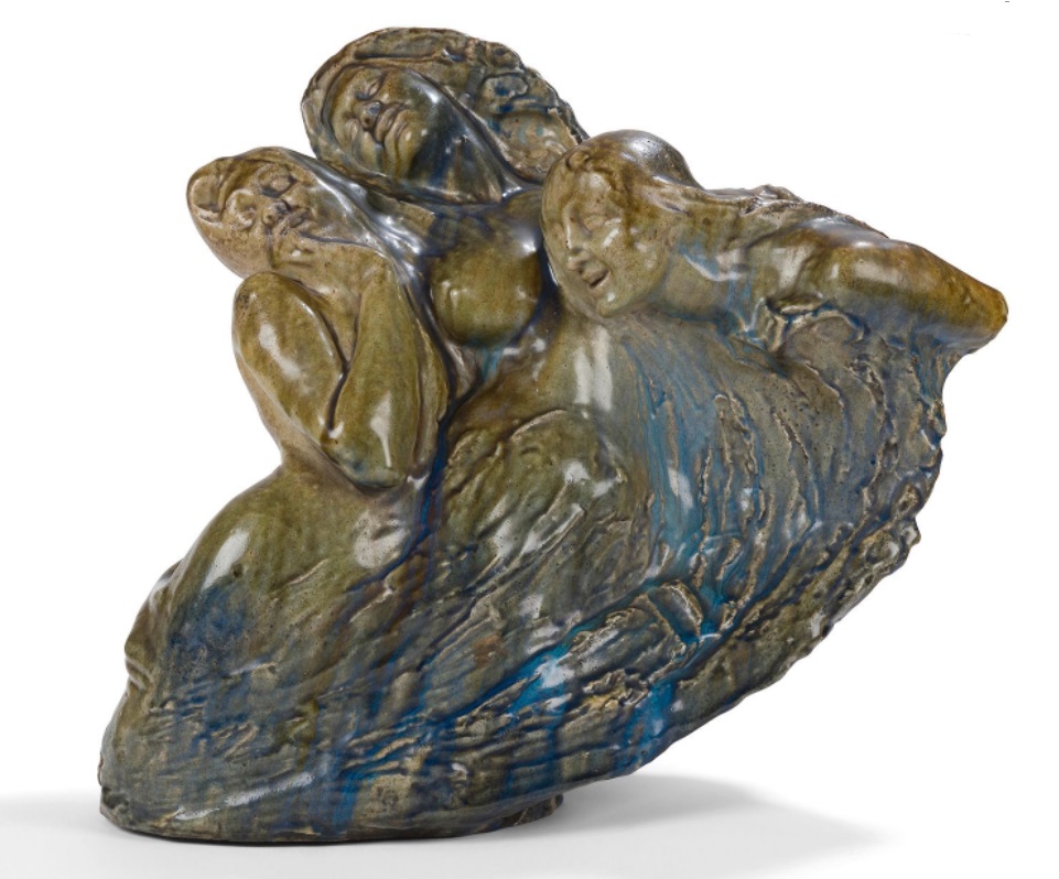 Lot 14. WACLAW SZYMANOWSKI (1859-1930) SCULPTEUR & MANUFACTURE ÉMILE MULLER À IVRY-SUR-SEINE – COLLECTION MARIE-CHRISTINE DAVID. Śmiejąca się fala (La vague souriante), le modèle créé en [1902], le modèle présenté au Salon de la Sécession, Vienne, 1902. Important groupe. Épreuve en grès émaillé polychrome. Circa 1900. Un léger éclat d’émail à la base. Signé SZYMANOWSKI et porte la mention Grès Émile MULLER en creux sous couverte à l’arrière au dos. Hauteur: 48 cm – Longueur : 55 cm – Profondeur : 23 cm Provenance : Succession Marie-Christine David.