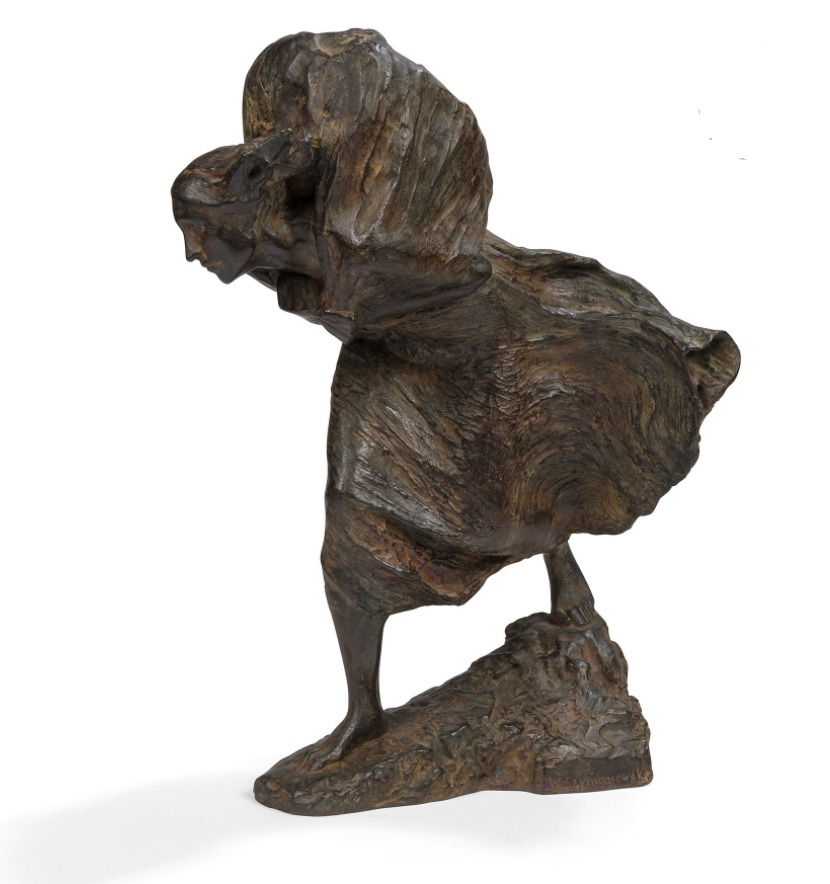 Lot 201. Waclaw SZYMANOWSKI (1859-1930). Le vent (Wiatr) [1899. Épreuve en bronze. Signée sur la terrasse. Hauteur : 47,5 Provenance : Selon le propriétaire, l’œuvre proviendrait de la collection de Włodzimierz (Vladimir) Bugiel, dispersée au début des années 2000 par son fils, Jean Bugiel. Bibliographie : KOTKOWSKA-BAREJA Hanna, cat. exp. Wacław Szymanowski, Muzeum Narodowe w Warszawie, 1981, pp. 12 et 56, fig. 9a-9c. La sculpture reprend le sujet d’une peinture de 1895, disparue à ce jour. Nous savons qu’il existait 4 épreuves «parisiennes» exécutées avant 1901 – Szymanowski en parle dans une lettre de 1901 adressée à T. Axentowicz. [sztuka polska, art polonais]. Estimate €3,000 – 5,000. Ader. 09/30/25