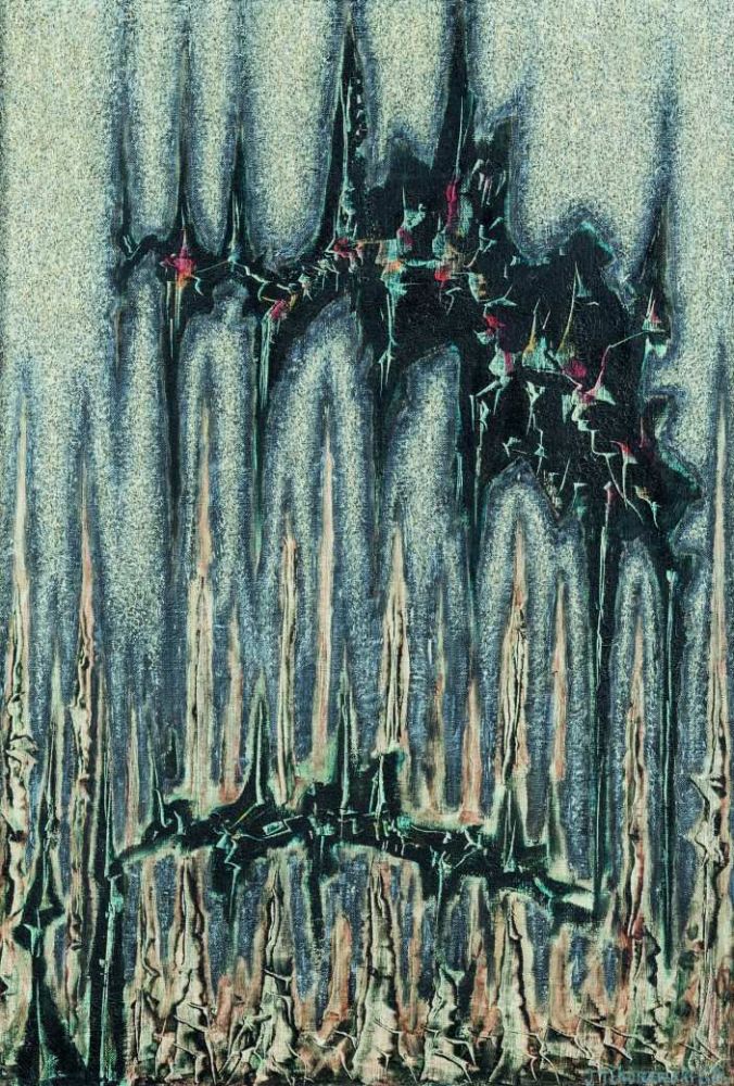 Lot 137. Jerzy Tchorzewski. Misterium VI, 1966, oil on canvas, 39.375 h x 31.875 w in (100 x 81 cm). Signed and dated to lower right ‘J. Tchorzewski 66’. Signed, titled and dated to verso ‘J. Tchorzewski 66 Misterium VI’. Provenance: Private Collection. Estimate $20,000 – 30,000. Rago. 09/26/25. Sold $28,000