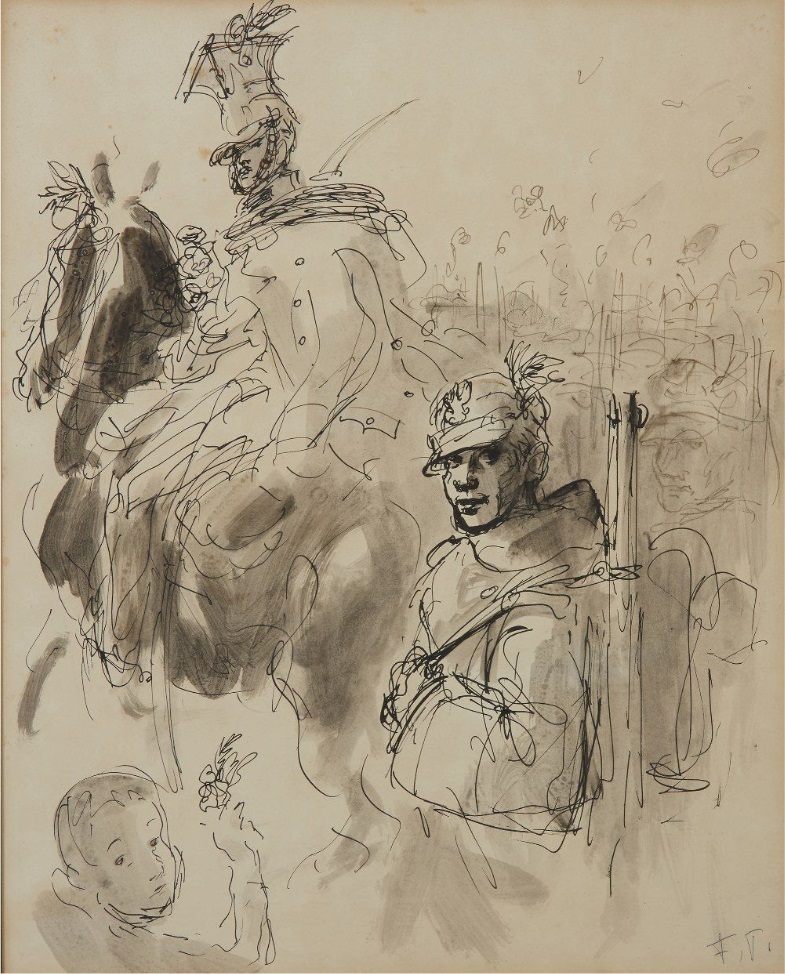 Lot 98. Feliks Topolski Polish/British 1907–1989. – Crowd scene with Polish soldiers; ink and wash on paper, signed with initials lower right, 39 x 31.4 cm (ARR). Provenance: Countess Czarski (née Munro), gifted by the artist; private collection, gifted by the above and thence by descent. Note: the soldiers are a Polish lancer wearing a shapka and great coat and an infantryman with a cap and slung rifle. Topolski was in the Polish reserves and worked as an Official War Artist for both the Polish government in exile in World War II and later for the British. These experiences resulted in the book ‘Britain in Peace and War, 1941’. The artist also created a large-scale mural to commemorate the coronation of HM Queen Elizabeth II in 1953, commissioned by HRH The Duke of Edinburgh. Estimate 600 – 800 GBP. Roseberys. 06/06/23. Sold 900 GBP