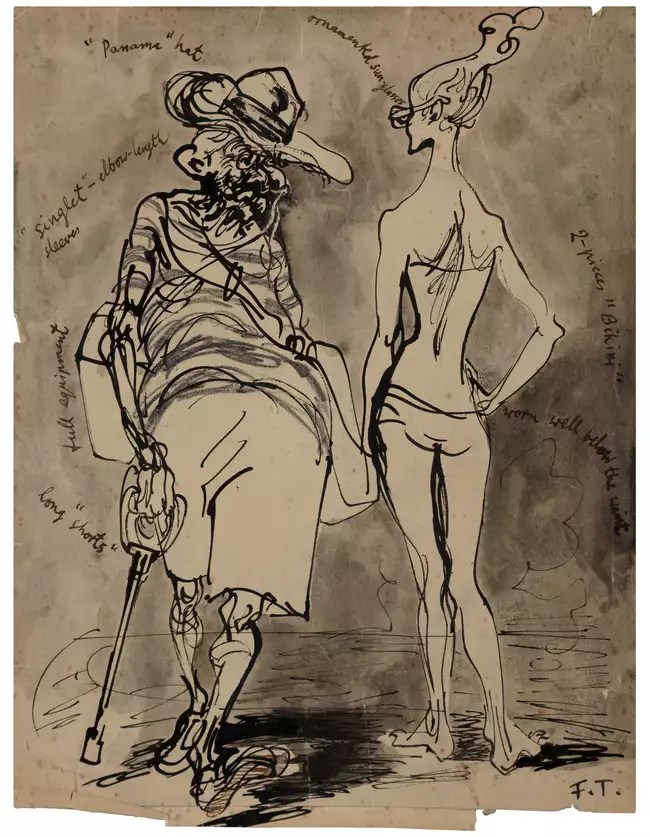 Lot 98. Feliks Topolski Polish/British 1907–1989. Two figures; ink, wash and pencil on irregularly-shaped paper, signed with initials lower right and annotated across sheet, 30 x 22.8 cm (unframed). Estimate £300 – £500. Roseberys. 09/12/23. Sold GBP 240