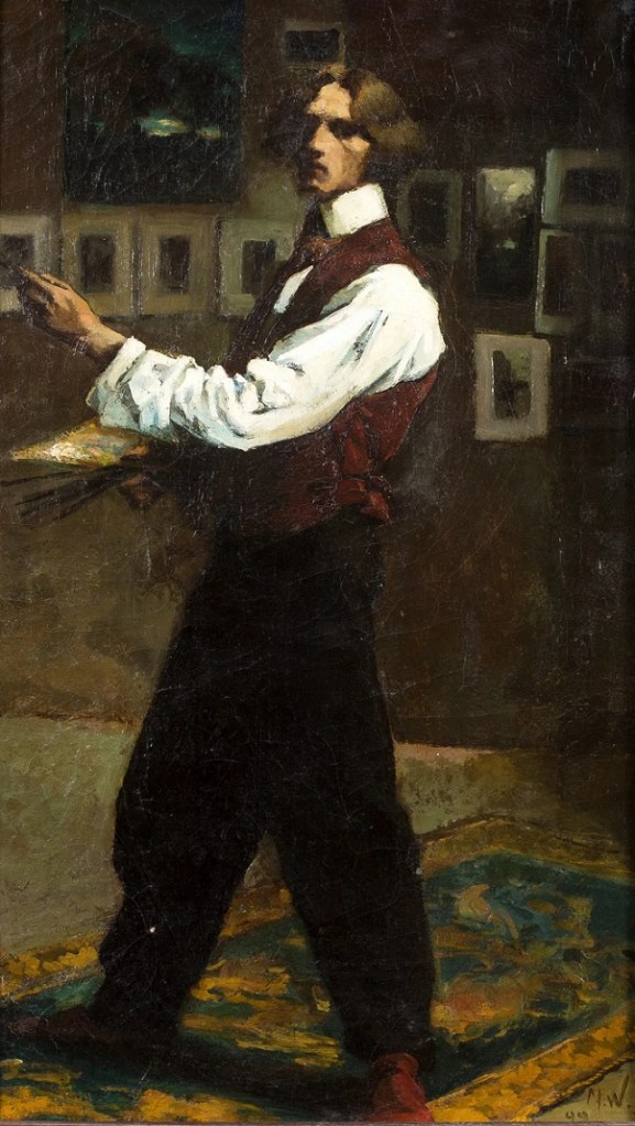 Lot 154. Marian WAWRZENIECKI Varsovie, 1863 – 1943. Autoportrait de l’artiste dans son atelier. Huile sur toile. Monogrammée et datée en bas à droite M.W, 69 x 39 cm. Rentoilée, raquelures et repeints épars, manques. (Vendu en l’état). Estimation 6 000 – 8 000 €. Aguttes. 02/18/21