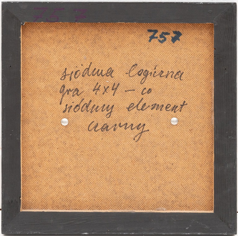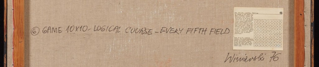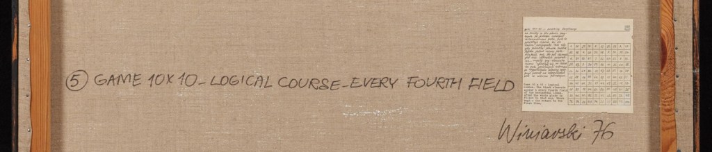 Lot 519WINIARSKI, RYSZARD. 1936 Lwiw/Ukraine – 2006 Warsaw. Title: “Game 10 x 10 – Logical Course – Every Fourth Field, 1976. Acrylic and pencil on canvas. 100 x 100cm. Inscribed, titled, signed and dated verso bottom: 5 (circled) GAME 10X10 – LOGICAL COURSE – EVERY FOURTH FIELD Winiarski 76. Here additionally with instructions on the work construction. Provenance: – Edition Galerie Hoffmann, Frankfurt a.M. – Private collection North Rhine-Westphalia acquired from the previous in 1979). Estimate €12,000 – 18,000. Van Ham. 06/05/25. Sold €15,000