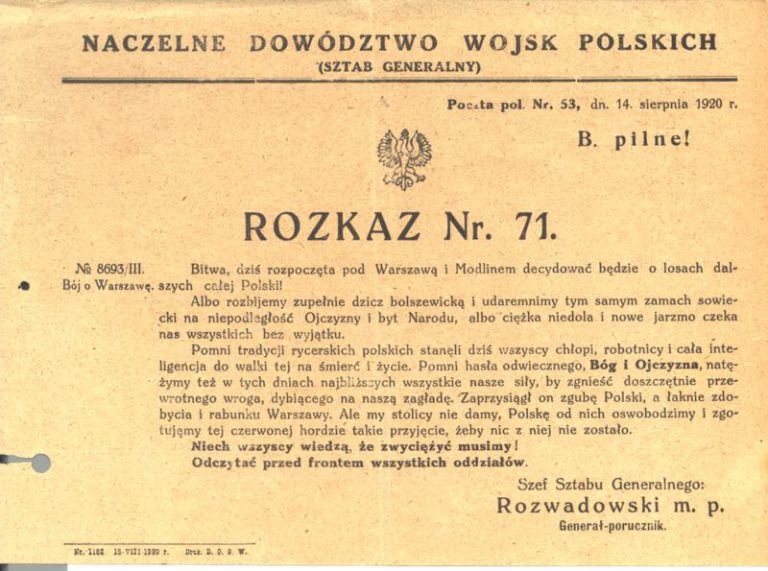 „Bitwa dziś rozpoczęta pod Warszawą i Modlinem decydować będzie o losach dalszych całej Polski. Albo rozbijemy zupełnie dzicz bolszewicką i udaremnimy tym samym zamach sowiecki na niepodległość Ojczyzny i byt Narodu albo ciężka niedola i nowe jarzmo czeka nas wszystkich bez wyjątku (…). Ale my stolicy nie damy, Polskę od nich oswobodzimy i zgotujemy tej czerwonej hordzie takie przyjęcie, żeby nic z niej nie zostało.”