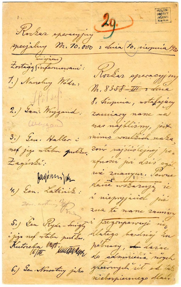 Poniżej, kopia rozkazu operacyjnego nr 10,000 wydanego w nocy z 8 na 9 sierpnia 1920 r. przez Szefa Sztabu Generalnego gen. Tadeusza Rozwadowskiego i jego ręką spisanego. Jest ostateczną modyfikacją planu bitwy warszawskiej. Generał chcąc zachować totalną tajemnicę, by plany nie wpadły w ręce nieprzyjaciela przedstawił je dowódcom do wglądu. Stąd ich podpisy poświadczają, że się z nimi zapoznali i będą je realizować. Ta ostateczna modyfikacja planu przesądziła o ostatecznym zwycięstwie Polaków w bitwie warszawskiej.