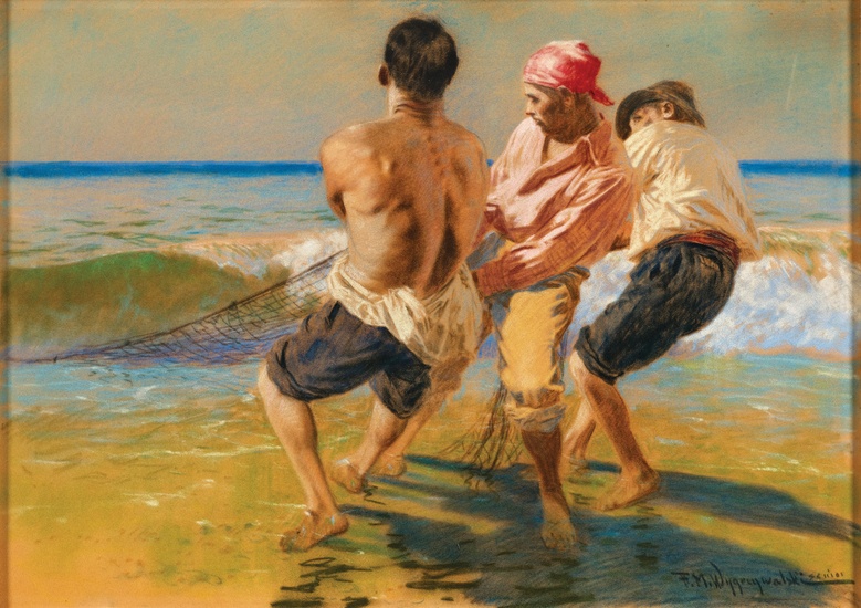 Lot 421. Felix Michael Wygrzywalski (Przemysl 1875-1944). Fishermen at the sea reel the net, signed F. M. Wygrzywalski senior, pastel on paper, laid down on cardboard, 50 x 69,5 cm, framed, exhibition stamp Salon Obrazow Malarzy Polskich, Lwów/Lemberg, Pitsudskiego 11, title: “Rybacy” on the reverse. Estimate 2,000 – 3,000 euro. Dorotheum. 10/04/23. Sold 4,200 euro