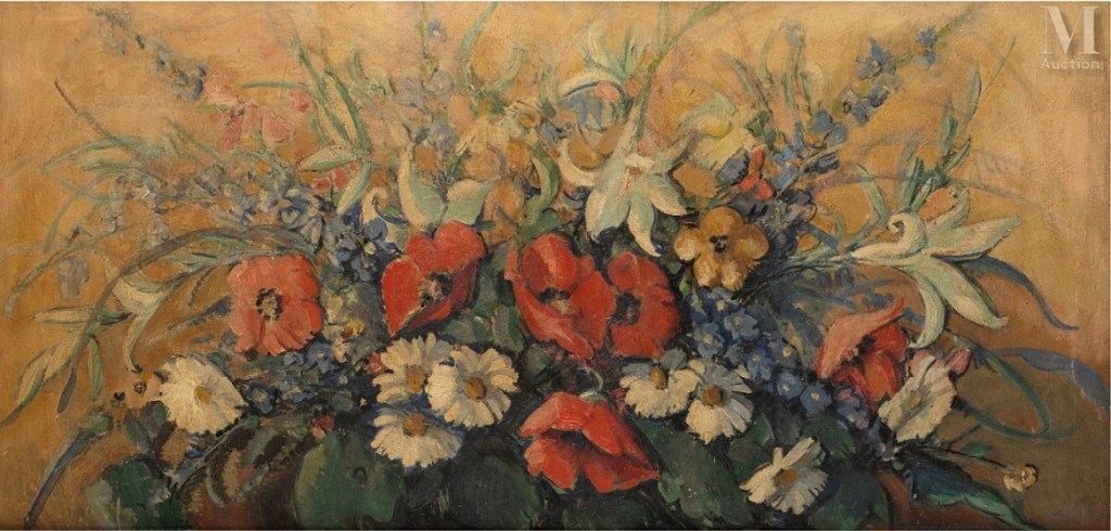 Lot 110. Czeslaw ZAWADZINSKY (Varsovie 1878 – 1936). Composition aux coquelicots et aux lys. Huile sur panneau 62 x 127 cm. Signé en bas à droite “Zawadzinki”. Estimate 500 – 600 euro. Millon. 02/15/23. Sold 500 euro