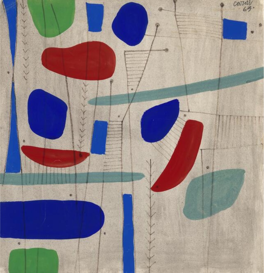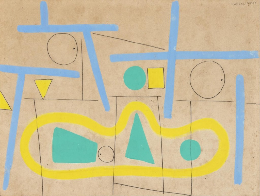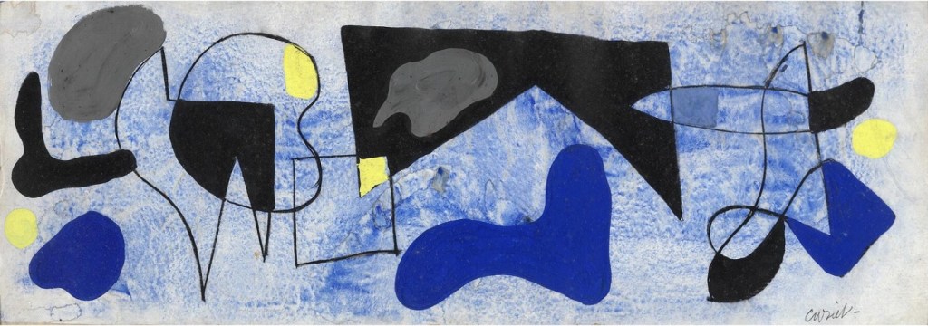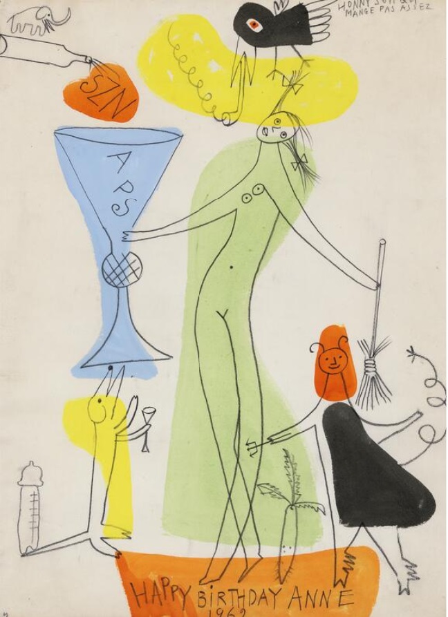 Lot 596. Caziel (b. Sosnowiec, Poland 1906, d. Somerset, England 1988). “Honny Soit Qui Mange Pas Assez, Happy Birthday Anne 1962” (Shame on the one who does not eat enough, Happy Birthday). Unsigned. Pencil and watercolour on paper. Visible size 62.5×45.5 cm. Provenance: Private collection, Denmark. Acquired directly from the artist by the current owner. Estimate 8,000–10,000 kr. Rasmussen. 09/29/21. Sold 10,500 kr