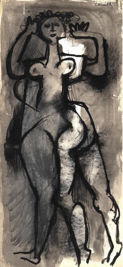 Lot 597. Caziel (b. Sosnowiec, Poland 1906, d. Somerset, England 1988). Standing female model. Signed Caziel 51 / 7. Indian ink and wash on paper. Sheet size 56×26 cm. Provenance: Private collection, Denmark. Acquired directly from the artist by the current owner. Estimate 3,000–4,000 kr. Rasmussen. 09/29/21. Sold 5,500 kr