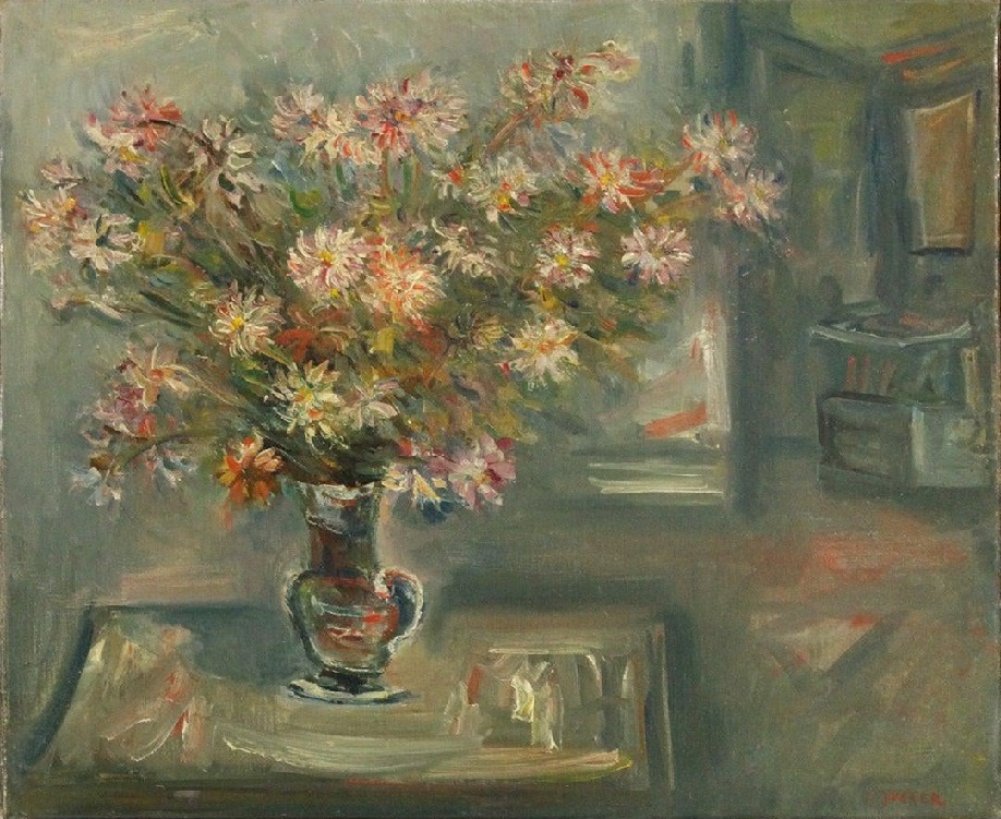 Łatwo rozpoznawalny styl tego malarza. Nawet jeśli sygnatura, jak w tym przypadku, jest mało czytelna wątpliwości raczej nie ma. Ciekawa kompozycja z bukietem kwiatów w wazonie na stoliku na pierwszym planie oraz wnętrzem pokoju z osobą we wnęce. Słowem, martwa natura i widok wnętrza na jednym płótnie choć materiału starczyłoby na dwie kompozycje.