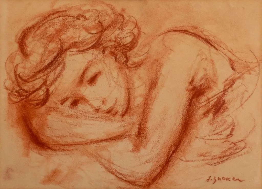 Lot 198. Jacques Zucker (Polish, 1900-1981). Red chalk drawing on paper depicting a female figure resting her head on crossed arms, signed “J. Zucker” lower right, housed under plexiglas in a gilt wood frame. Image: 9.75″ H x 13.75″ W; frame: 17″ H x 21″ W. Estimate $400 – 600. Auctions at Showplace. 06/23/23. Sold for $1,000.