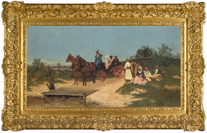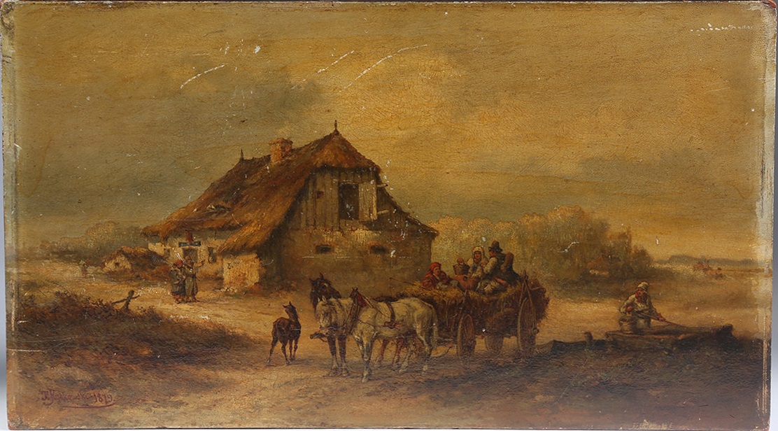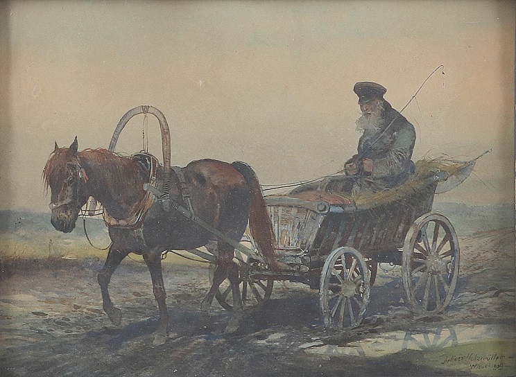 Bardzo smutny, beznadziejnie smutny obrazek Żyda na wozie ciągnionego przez szkapę wystawiło Dorotheum w marcu 2020 z ceną wyjściową 260 euro i nie wiem za ile go sprzedało, choć sądzę, że nie za wiele wyżej. Agra-Art ma te akwarelkę w swoim katalogu na aukcji 22 czerwca 2020 (lot #22) z ceną wyjściową 3,500 złotych i szeroką jak guma od portek wyceną 4,000 – 8,000 złotych. Przykład, że sprzedawca ma na oku kolekcjonera o słabym wzroku.
