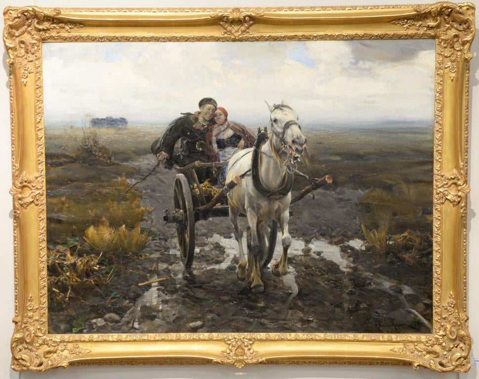 Obraz ten pojawił sie na marcowej aukcji (2024) w Agrze-Art. Nie pisałbym o tym, gdyby dom aukcyjny nie zaczął bajać i tworzyć proweniencję, któej nie było i nie ma. Na podstawie nalepki na ramie, bajarze utowrzyli historię o możliwości posiadania tej pracy przez cesarzową Sisi w Niemczech. A przecież wyrażnie na niej ktoś napisał ołówkiem, że obraz był przewożony koleją(?) z docelową stacją Munchen-Ost, czyli Monachium-Wschodni. Natomiast Agra-Art tak na prawdę to ‘zapomniała‘ napisać o prawdziwej proweniencji z USA, a konkretnie z domu aukcyjnego Skinner: https://polishartcorner.com/2023/02/17/alfred-wierusz-kowalski-1849-1915-70/. Obraz ten był tam sprzedany za $215,000 (ok. 860,000 zł) i teraz wstyd jej przyznać, że właściciel stara się zarobić ok 400,000 zł (cena wyjściowa 1,200,000 zł), choć handel to nie jest żaden wstyd – może jedynie optycznie to źle wygląda. Agra-Art wycenia ten obraz na 1,300,000 – 2,000,000 (ok. $325,000 – 400,000) co dałoby znaczny zarobek w sytuacji gdy rynek polski ledwo dycha. Oto bajka Agry Art: