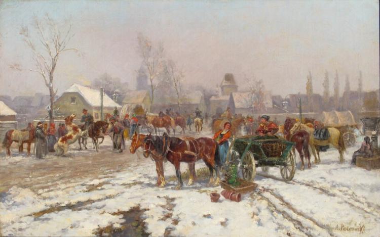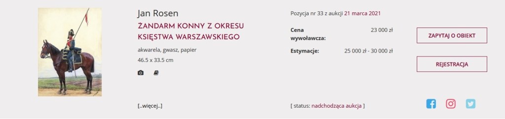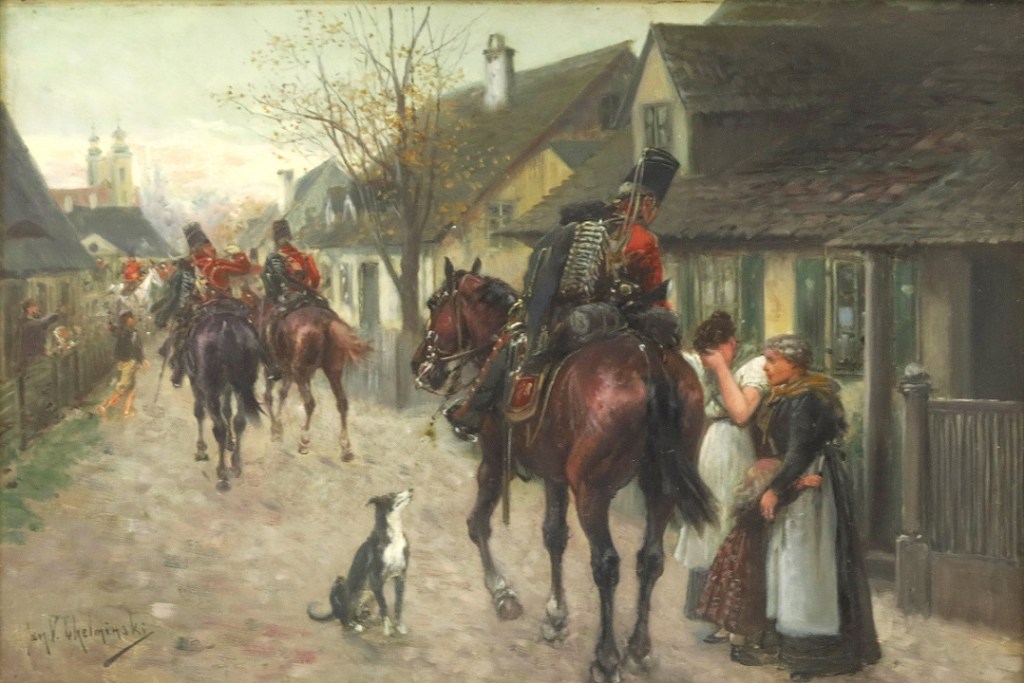 W porównaniu z Wieruszem (poniżej) jest tutaj dużo spokojniej. Ketterer Kunst w Niemczech sprzedał przeszło rok temu tego chorążego na koiu (https://polishartcorner.com/2019/05/30/jozef-brandt-1841-1915/ ) za blisko $100,000 (ok 400,000 złotych). Agra-Art wystawiła ten obraz na aukcji 21 czerwca 2020 (lot #16) z ceną wyjścową 430,000 złotych i wyceną 450,000 – 500,000 złotych. Dużo spokojniej i rozsądniej niż poniżej.