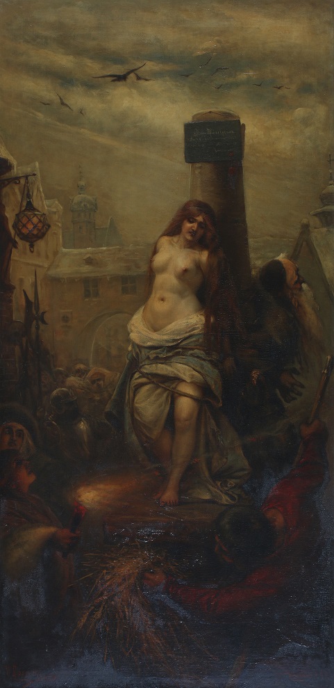 Fakt z historii Polski, którym było Spalenie Katarzyny Melchiorowej w 1539 roku na rynku w Krakowie uwiecznił w 1883 roku na płótnie Władysław Rossowski. Praca ta, ucznia Jana Matejki i inspirowana chyba zainteresowaniami nauczyciela, sprzedana została w listopadzie 2020 roku za 3,600 euro. https://polishartcorner.com/2020/11/10/wladyslaw-rossowski-1857-1923/. Korespondowałem w tamtym czasie z jednym z czytelników, który uważał, że nie będzie zaintesowania nią w Polsce. Miałem inne zdanie i oto, po konserwacji, obraz ten pojawił się na aukcji w Desie Unicum z wyceną 45,000 – 60,000 złotych (lot 44, 14 październik, 2021). Obraz został oczyszczony ze starego werniksu i prezentuje się nieźle. Tylko, czy znajdzie się chętny do powieszenia w domu chyba pierwszego przypadku w Polsce spalenia na stosie kobiety, nie za czary a za dokonanie apostazji? Rozebranie przez artystę rzeczonej Weiglowej niemal ‘do rosołu’ chyba mija się z prawdą. Kobieta ta w chwili spalenia miała blisko 80 lat o czym Rossowski albo nie wiedział albo trudno mu było znaleźć modelkę w tym wieku gotową do pozowania, w dodatku z taką figurą.😊