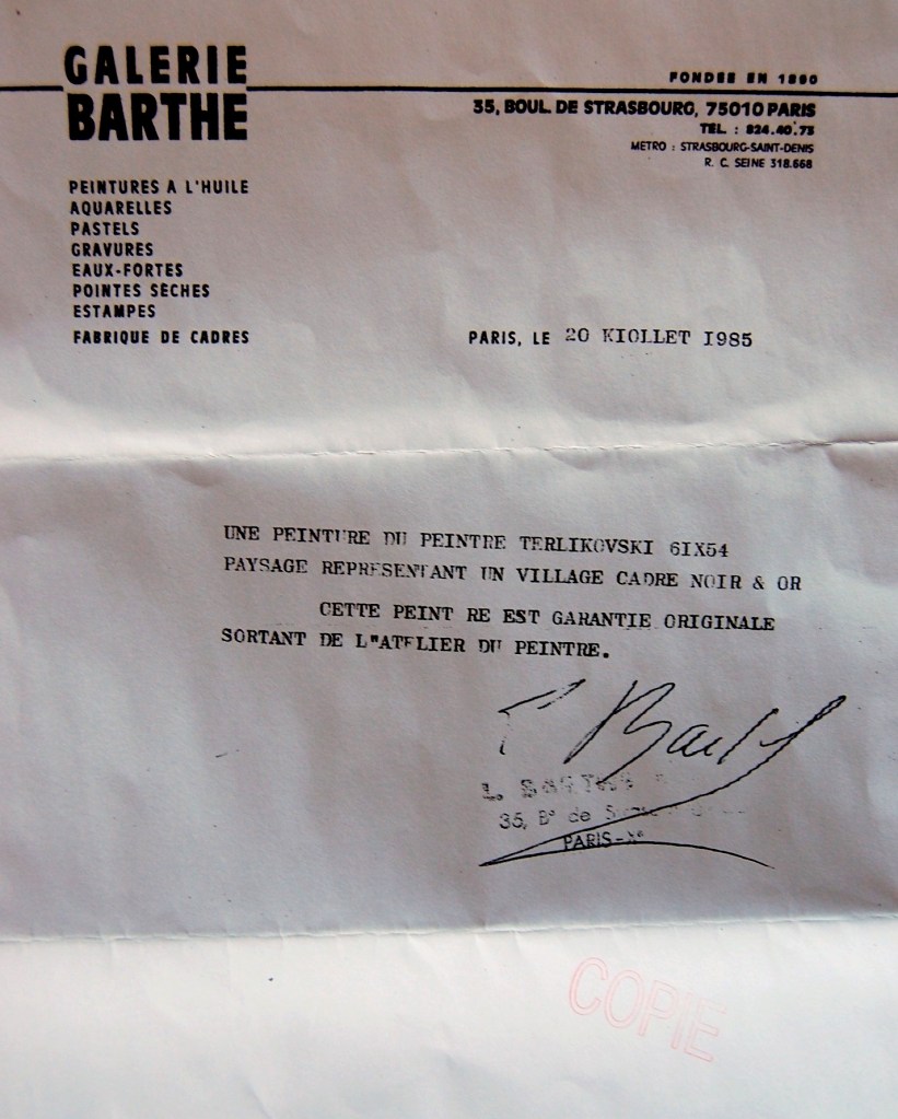 Pewien rodak kupił na aukcji we Francji obraz podpisany “W. Terlikowski”. Mimo że malowany szpachlą budził jak największe wątpliwości, tak ze względu na fakturę, kolory oraz podpis. W związku z nieprzychylną opinią niżej podpisanego, nabywca zwrócił się do domu aukcyjnego o unieważnienie transakcji. Ze swojej strony aukcjoner zasłaniał się certyfikatem, który tu reprodukujemy, a którego ważności nie chciał uznać klient. Ostatecznie sprawa oparła się o Radę Aukcyjną (Conseil des Ventes), która z kolei zwróciła się do mnie o pisemną opinię.