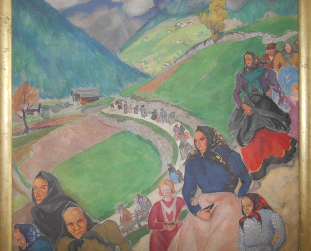Jak już nadmieniłem interesowały nas nie tylko polonica, ale też kupowaliśmy rzeczy które nam się podobały, nawet jeśli artyści byli całkiem nieznani. Sięgając wstecz, pewnego razu, a było to gdzieś w 1976 roku, uwagę naszą przykuło wielkie płótno przedstawiające kobiety w strojach ludowych wracające z kościoła na tle szerokiej panoramy górskiej z wioską w tle. Całość była zupełnie w duchu naszych „Hucułów“ – Pautscha, Axentowicza czy Jarockiego, ale podpisana „Zanon“. O tym malarzu przez długie lata nie udało mi się znaleźć żadnej informacji, oprócz tego że nazwisko to pochodzi z okolic jeziora Como, a więc że jest to najwyraźniej rodak słynnych „Komasków“ – muratorów Włoskich sprowadzonych do Polski, którzy budowali nam renesansowe pałace i zamki. Tego „grzmola“ mierzącego półtora metra wylicytowanego za jedne 350 Franków, a który nie wchodził do żadnego z naszych samochodów, nieśliśmy z Wojtkiem ze dwa kilometry ruchliwą rue du Bac i Bulwarem Raspail, niczym filmowi Dwaj Ludzie z Szafą. Potem wnieśliśmy go sześć pięter bez windy do naszego pokoiku wówczas jeszcze na poddaszu. Wiele lat później, zaprzyjaźniony specjalista od plakatu Gianfranco Torri wydobył od jakiegoś kustosza włoskiego nagryzmoloną biografię Zanona. A tam (o ile nie znam się na włoskim) ) czytam że ‘nie wiadomo aby przebywał w Europie Centralnej’, co poddało w wątpliwość „huculskość” artysty. Ten nabytek również był wspólny, z tym, że co prawda ja później odkupiłem wkład Wojtka, ale umowa stanęła taka, że gdybym kiedykolwiek sprzedawał Zanona, dzielimy się zyskiem po połowie. Jak dotąd obraz stoi nadal u mnie na komodzie. A swoją drogą, ciekawy to przypadek podobieństwa folkloru góralskich ludów, tak od siebie oddalonych…. (07/22/24)