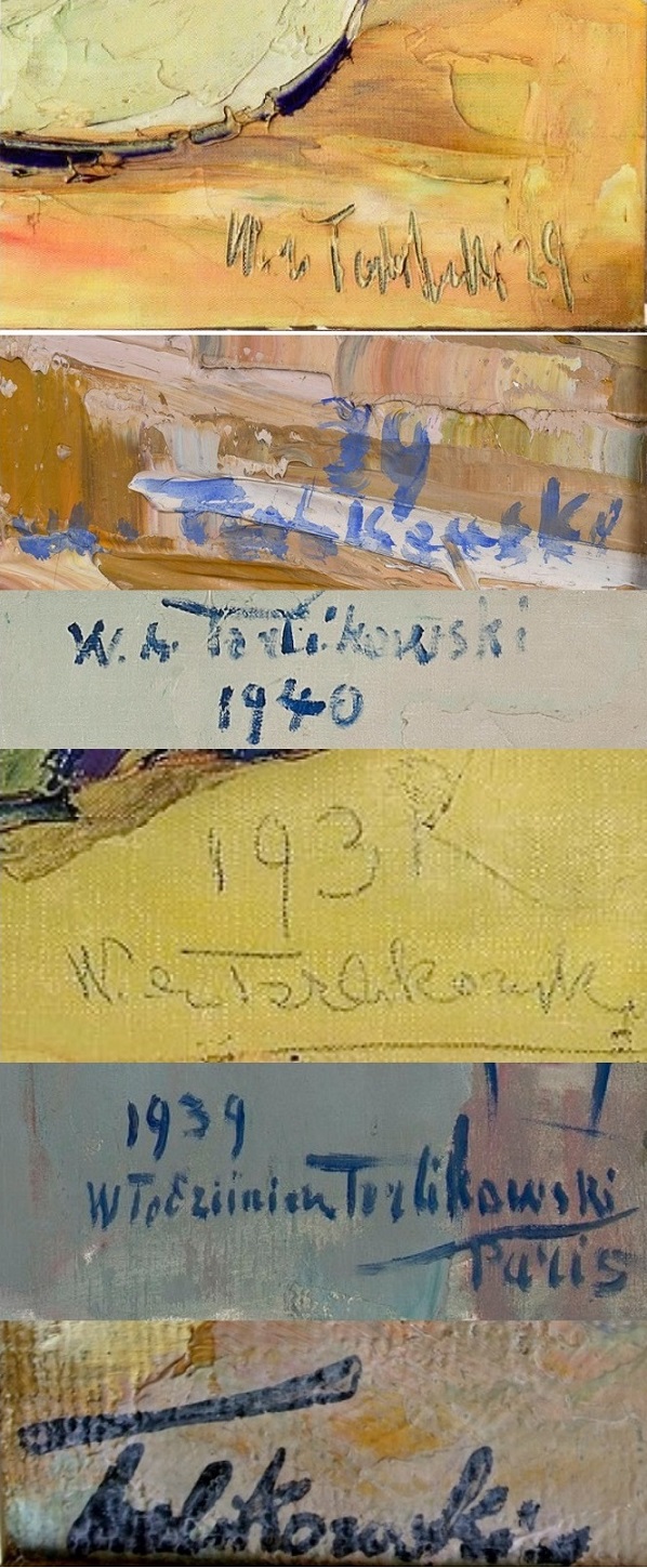 Zauważmy że plaga falsyfikatow nie jest tak bardzo dokuczliwa w wypadku naaszego malarza. Technika malowania szpachlą wymaga specjalnego talentu i wprawy. Jak twierdzą fachowcy również nie są to obrazy łatwe do konserwacji ale także czyszczenia. Obrazy Terlikowskiego są sygnowane, jak mało którego malarza, w najrozmaitsze sposoby. i trudno tu wskazać jakiś typowy model. Ich forma zależy oczywiście od grubości pędzla jakim nakłada farbę – olejną lub wodną – lub ryje w świeżej farbie końcem pędzla lub ołówkiem. Są tam podpisy wiązane lub z literami dzielonymi, czasem pochyłe czasem proste. W autoportrecie w zbiorach MNW znajdujemy wyjątkowo polską wersję jego imienia ‘Włodzimierz’. Proszę natomiast zwrócić uwagę na ostatni przykład tu cytowany. Nie jest to podpis w ścisłym słowa tego znaczeniu, lecz tzw. ‘timbre d’atelier’. Jest to pieczęć mniej lub bardziej oparta na oryginalnej sygnaturze, którą stemplowano pozostałe niepodpisane obrazy jakie pozostały po śmierci artysty.