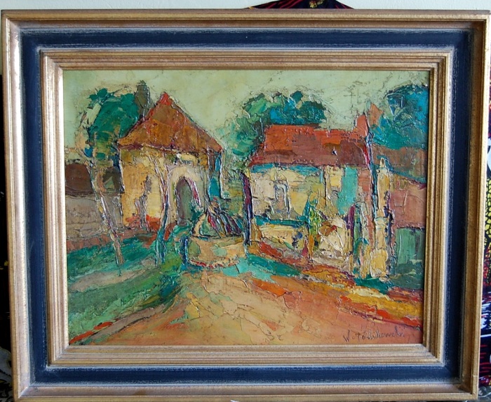 “Malunek malarza Terlikovskiego 61 x54 cm. Pejzaż przedstawiający wioskę. Rama czarna i złota. Ten obraz jest gwarantowanie oryginalny pochodzący z pracowni malarza”.