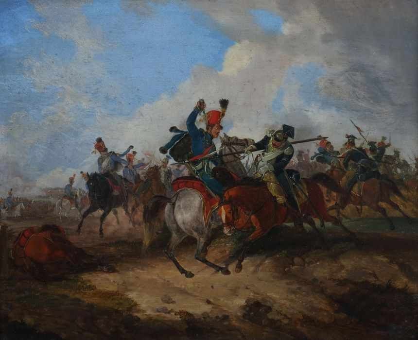 Lot 2495. Monten, Dietrich Düsseldorf 1799 – 1843 Münchden, deutscher Maler. “Schlachtenszene“, Darstellung eines. Reitergefechts zwischen polnischen Ulanen der Grande Armée und österreichischen Husaren, rechts unten monogr., Öl/Holz, HxB: 29/37 cm. Altersspuren, rest., part. ret.. Mit Rahmen. Reserve 3,500 euro. Yves Siebers Auktionen. 11/14/19