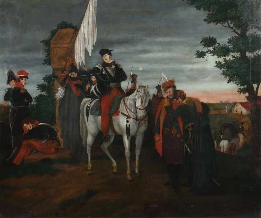 Lot 2455. Maler/Kopist des 19. Jh.”Finis Poloniae“, Darstellung des polnischen Oberbefehleshabers Tadeusz Kosciuszko zu Pferd, nach der verlorenen Schlacht bei Maciejowice, von trauernden Soldaten umgeben, Darstellung nach Dietrich Monten in der Alten Nationalgalerie – Staatliche Museen zu Berlin, unten links undeutl. sign. und dat. 1839, Öl/Leinwand doubliert, HxB: 60/70 cm. Altersspuren, Craquelée, min. Farbabplatzer, rest. Reserve 250 euro. Yves Siebers Auktionen. 11/14/19