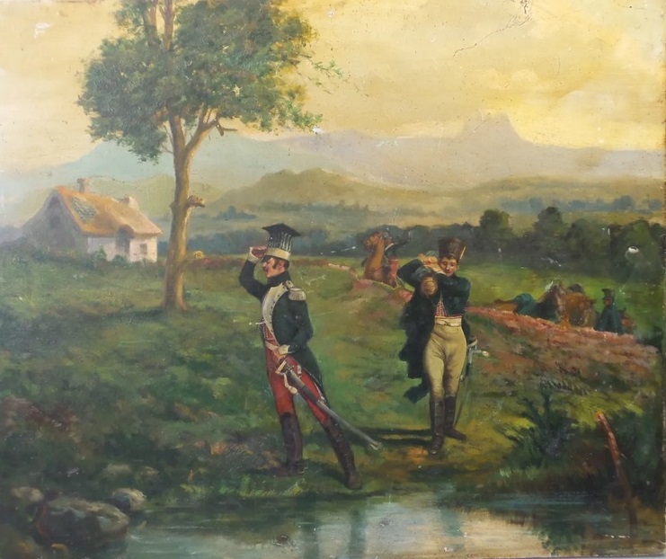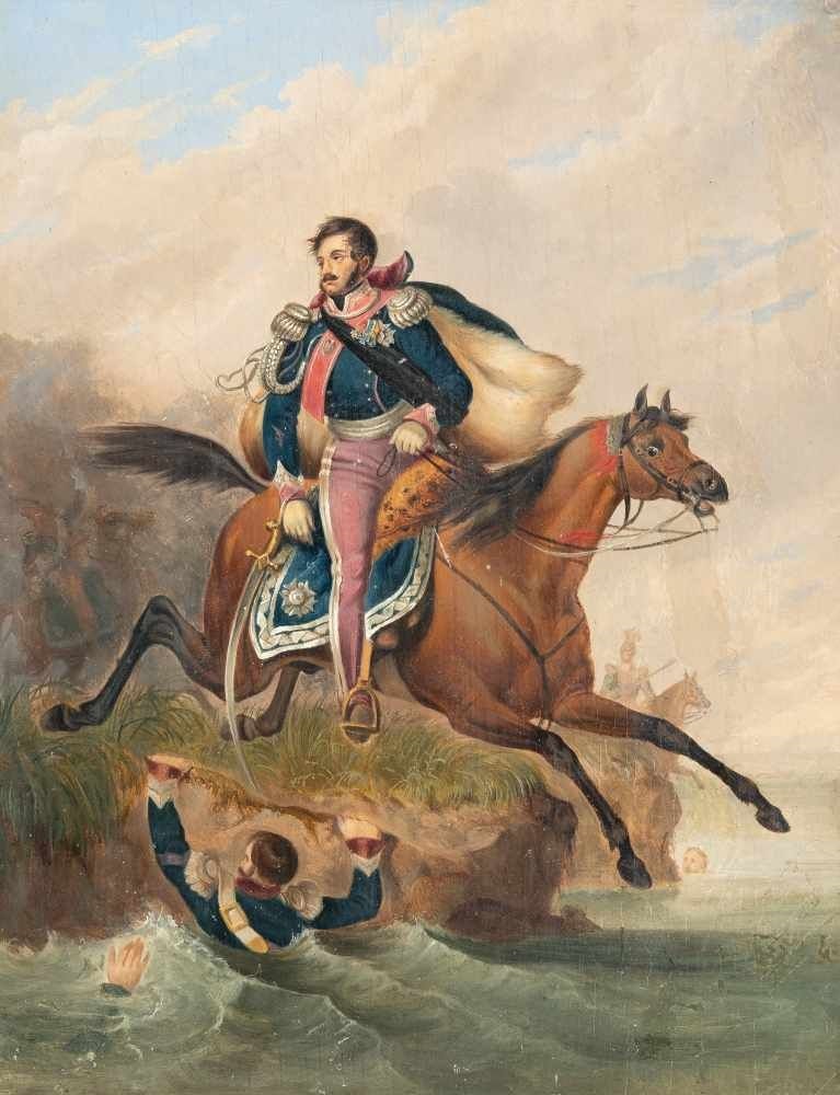 Lot 102. Albrecht Adam (?) 1786 Nördlingen – Munich 1862. Prince Poniatowski’s leap into the Elster river. Oil on panel. 27.5 x 21.5 cm. Label from the J. B. Roili gallery on the back. Provenienz: Privatbesitz, Süddeutschland. Estimate 3,000 – 4,000 euro. Karl & Faber Kunstauktionen. 11/08/19