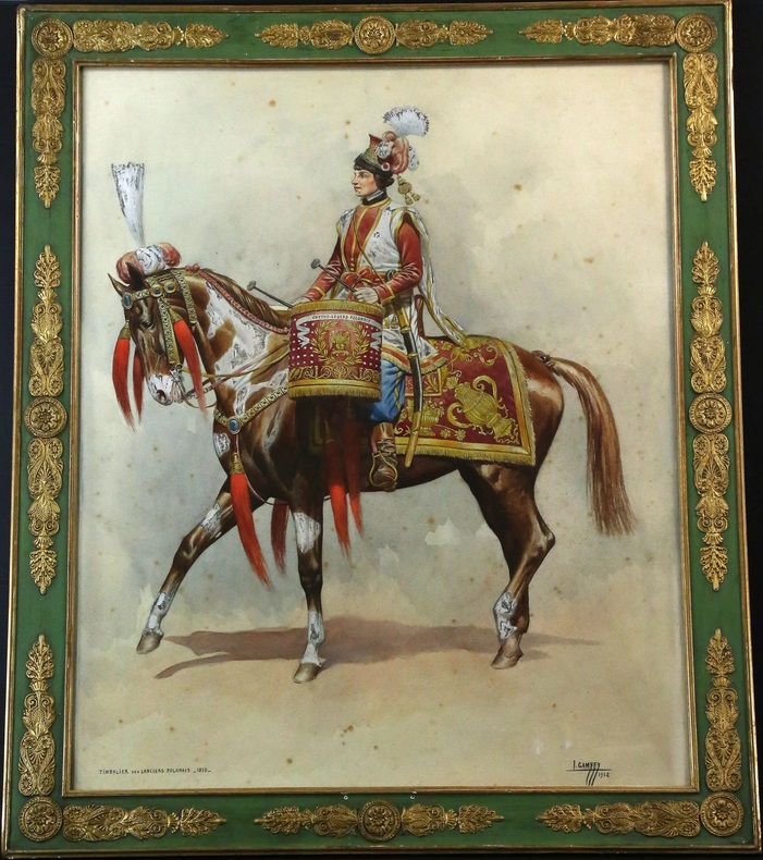 Lot 134. GAMBEY Léon (1883-1914). Timbalier des Lanciers polonais, 1810, aquarelle, sbd et datée 1912, 62 x 50 cm (rousseurs). Dans un cadre de style Empire, laqué et doré. Ancienne collection Maurice TREVELOT de TREVALOT, Metz. Estimation: 200 – 300 €. Sarl Est Enchères – F. de METZ-NOBLAT – L. THOMAS. 10/12/19