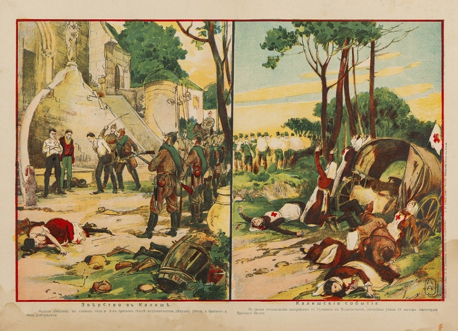 Rosyjski plakat pokazujący bestialstwa wojsk niemieckich w Kaliszu w sierpniu 1914 roku. Miasto zostało zupełnie zniszczone a wielu bezbronnych mieszkańców zostało rozstrzelanych przez regularne wojska niemieckie. To był dopiero poczatek I wojny światowej.