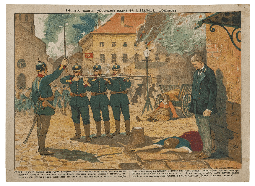 Lot 134. Victime du devoir, le trésorier provincial de la ville de Kalish-Sokolov. Moscou. Lithographie de Sytin, 1914. Lithographie en couleurs. 32 x 42 cm. Estimate 200 – 300 euro. OVV Caudron. 12/09/19