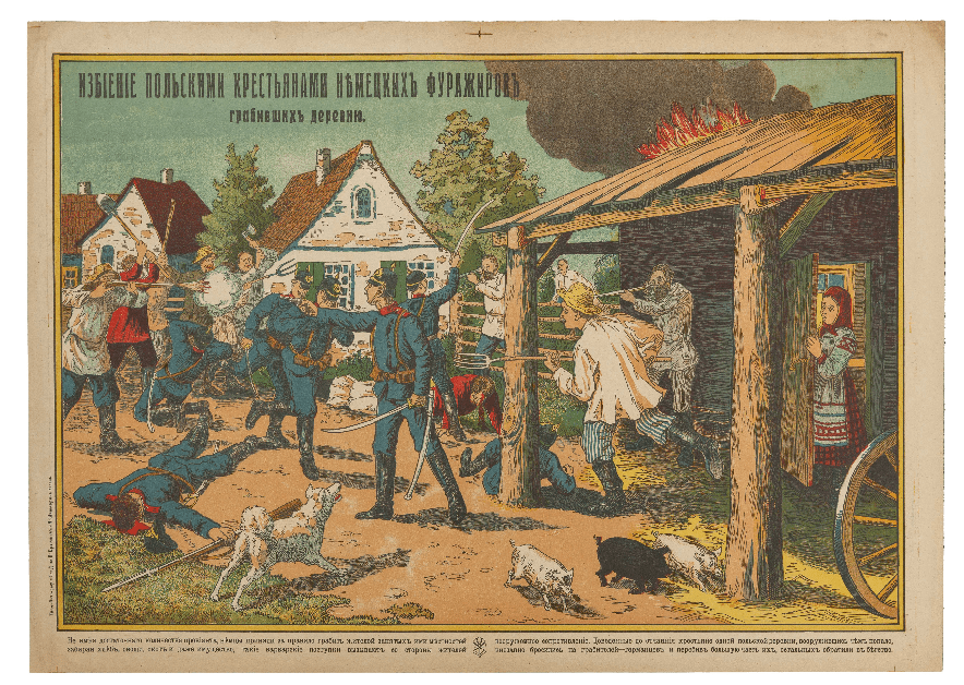 Lot 136. Les paysans polonais frappent les voleurs allemands. Kazan, typo-lithographie Eremeev & Chachabrine, [1914]. Lithographie en couleurs. 42 x 62 cm. Estimate 200 – 300 euro. OVV Caudron. 12/09/19