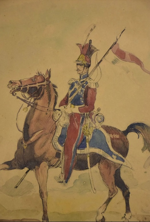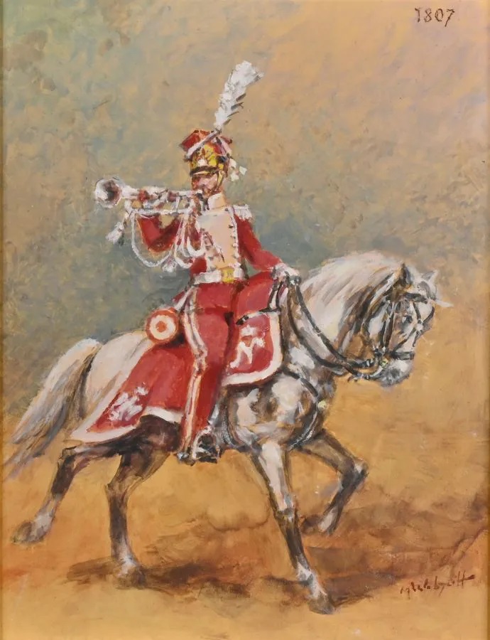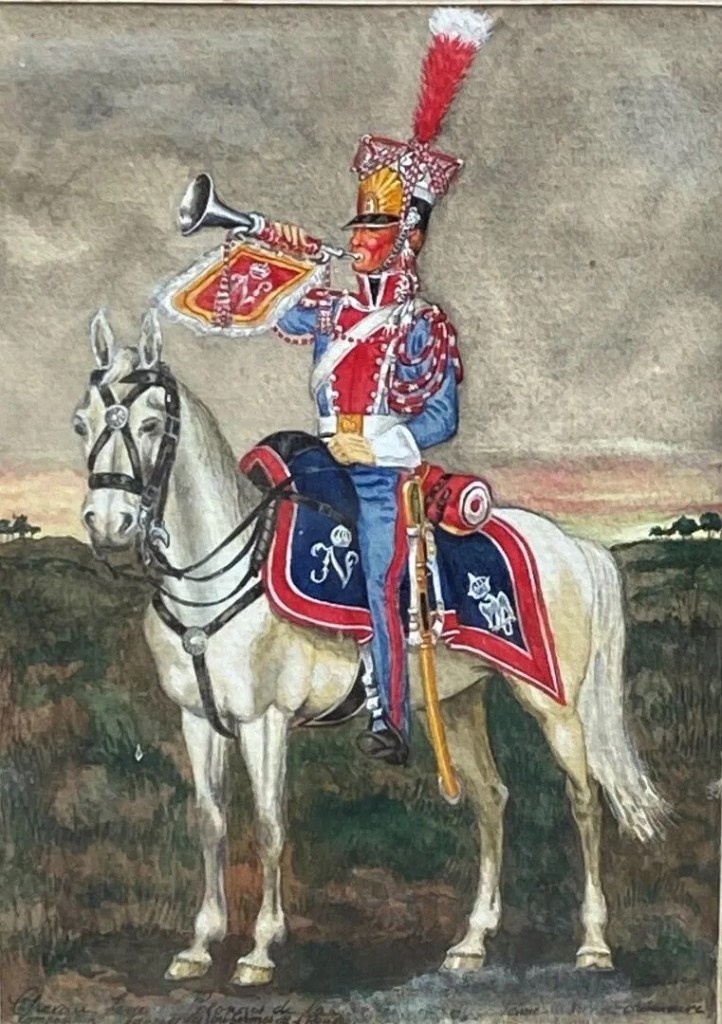 Jedna z dwóch akwareli nieznanego francuskiego malarza przedstawiającego trębacza nieznanego mi oddziału polskiego z czasów wojen napoleońskich.