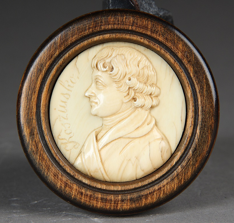 Lot number: 5539667.Elfenbensportræt af Tadeusz Kosciuszko, 1800-tallet. Rundt portræt udskåret i relief af elfenben forestillende den polske nationalhelt Tadeusz Kościuszko (1746-1817) i profil, 1800-tallet. Ø 4,3 cm. I ramme af træ på Ø 6,5 cm. Kościuszko var general og anfører for den såkaldte Kościuszko-opstand mod Rusland og Preussen i 1794. Han kæmpede også i den amerikanske uafhængighedskrig på George Washingtons side. Estimate DKK 1,000 (125 euro). Lauritz. 01/20/19.