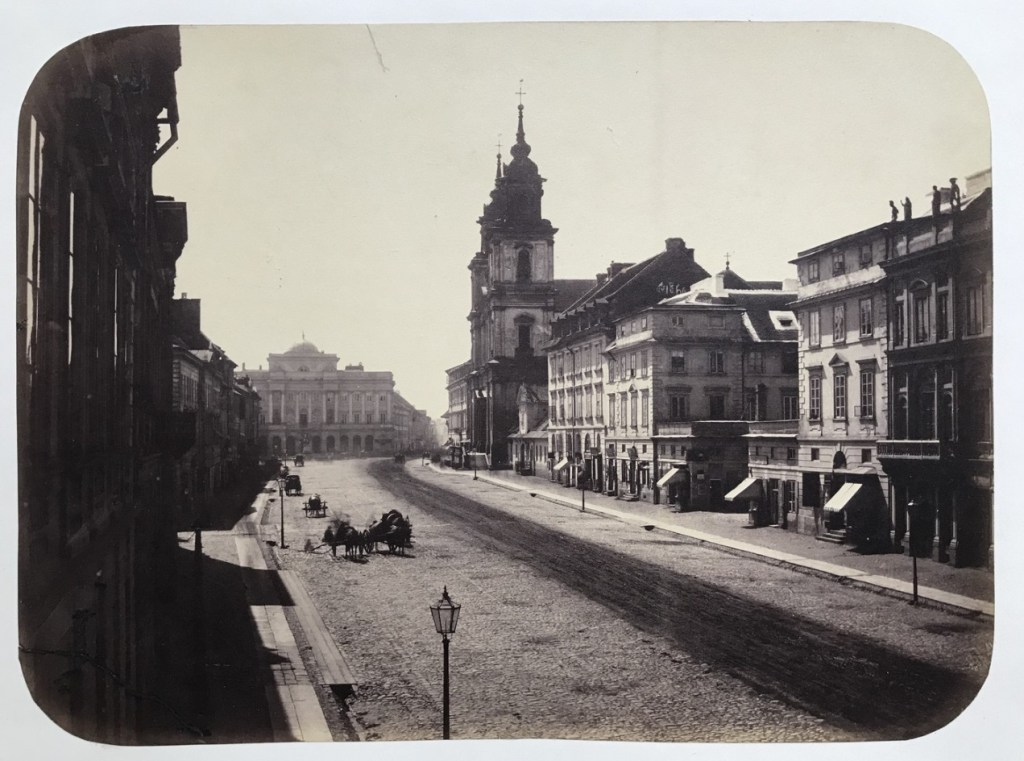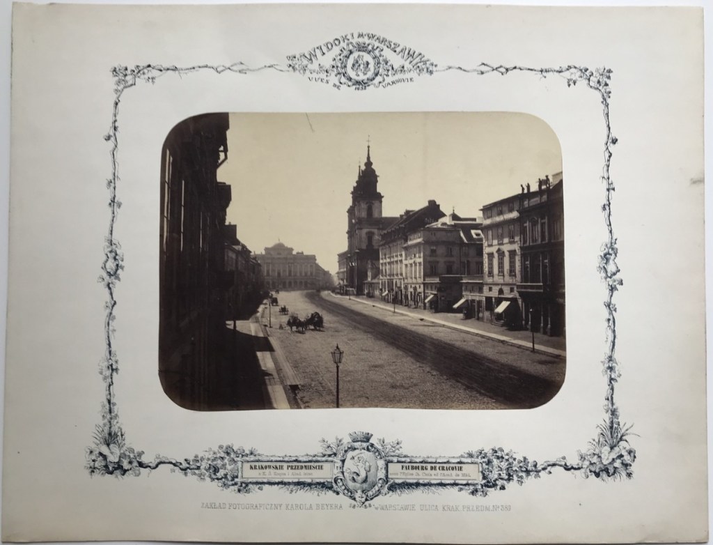 Duży cymes dla kolekcjoneów warsawian. Oryginalan duża fotografia Karola Bayera, oprawiona w jego pracowni, przedstawiająca widok Krakowskiego Przedmieścia z roku 1860, z widokiem na kościół św. Krzyża oraz Pałac Staszica.