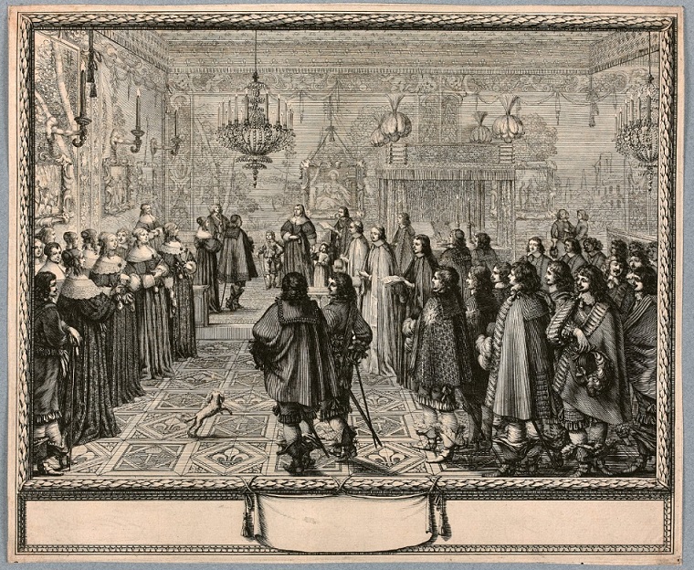 Lot 66. Abraham BOSSE (Tours 1602-Paris 1676). Cérémonie observée au Contrat de Mariage passé à Fontainebleau en présence de leurs Majestez Entre Vladislaus IIII du nom, Roy de Pologne et de Suède, etc. par son Ambassadeur le Seigneur Gerhard Comte Dunhost, palatin de Poméranie d’une part, et Louise Marie de Gonzague, Princesse de Mantoue et de Nevers, d’autre part le 25ème jour de Septembre 1645. Eau-forte et burin. Duplessis 1223 – Blum 422. In-folio en largeur. Superbe et fort rare épreuve du 1er état (sur 2) avant toute lettre. Filets de marges. Très belle pièce en remarquable épreuve. Estimate 1,800 euro. Ferri. 05/01/20