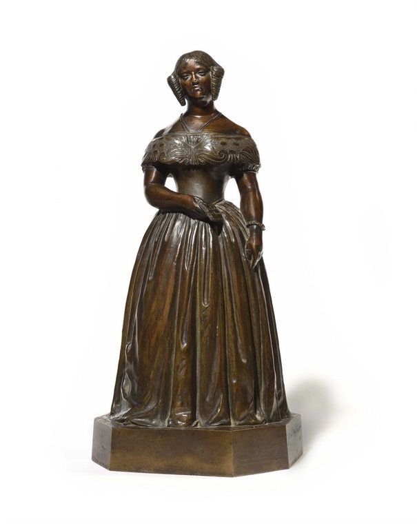 Lot 284. Figure de jeune femme en bronze à patine brune, tenant à la main une lettre inscrite : « Mme de Laska à Varsovie » (probablement le nom du modèle). Signée et datée Franzoni 1840, marque de la fonderie Richard, Eck et Durand. Haut : 41 cm. Estimation: 600 – 800 €. David Gelly. 03/22/20