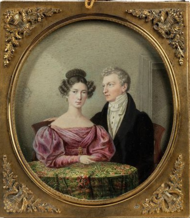 Lot 231. Josef Kriehuber, 1801 – 1876. PICTURE OF THE MARRIA AND JOSEPH ZACHARIASZ, married couple Gouache on paper. Frame dimensions: 17.7 x 15.7 cm. Signed and dated “1819” at lower left.
